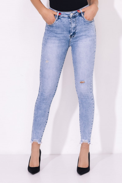 Amnesia Fashion - Eva Prokai - farmernadrág,világoskék színben, gombos és cipzáras záródással, klasszikus ötzsebes, koptatott és szaggatott fazonban, elvarratlan szaggatott szárvéggel, farzsebén rávarrt fém márkajelzéssel.