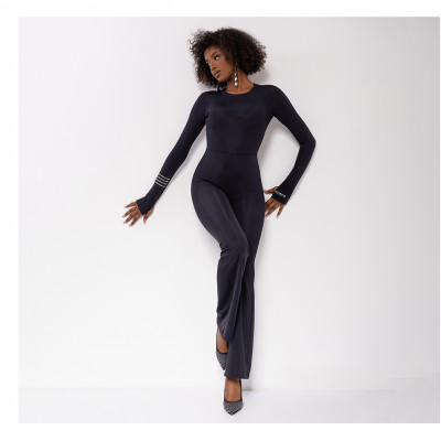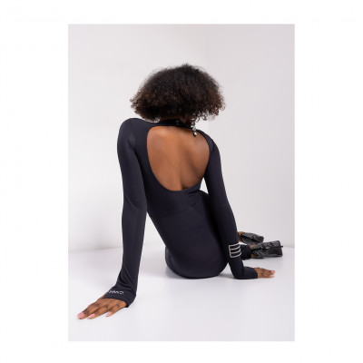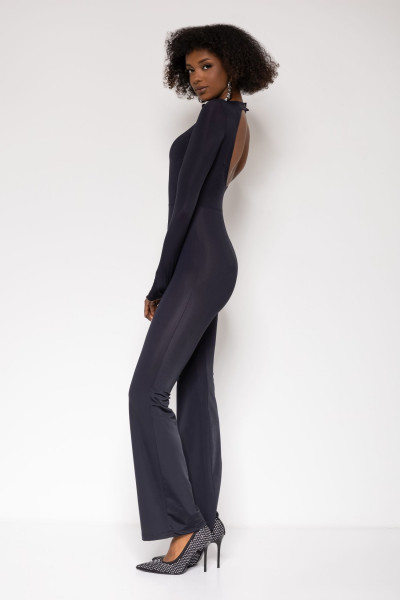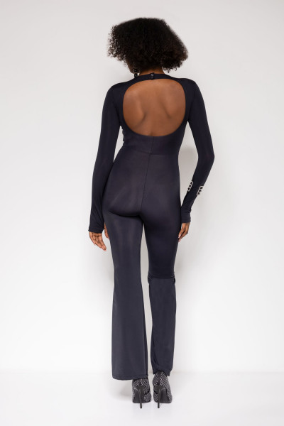Amnesia Fashion - Eva Prokai overál, fekete színben,fényes anyagból, kerek nyakkivágással, szűk fazonban, trapéz szárvéggel, ujján filmnyomott márkajelzéssel.