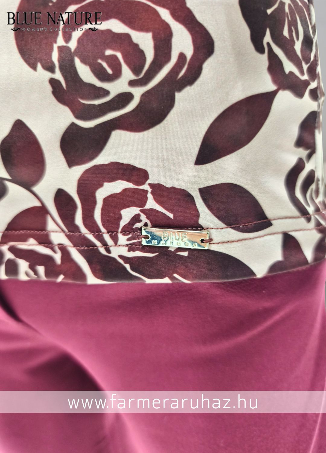 Blue Nature női felső, karcsúsított fazonban, bézs színben, vörös rózsa mintával, V nyakkivágással, állógallérral, alján fém márkajelzéssel.
