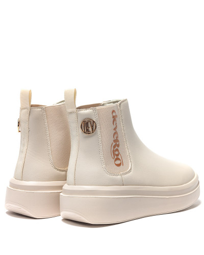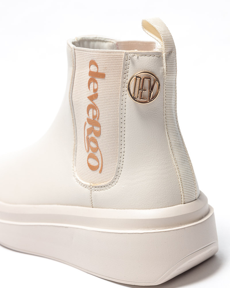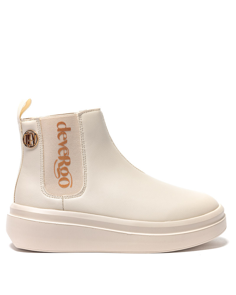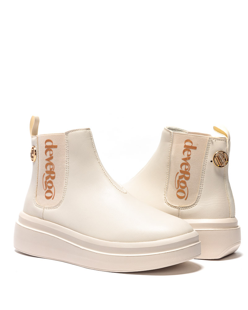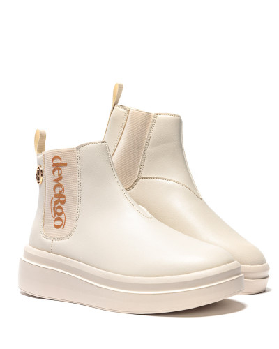 DevergoJeans női bokacsizma bézs színben; vastag bézs színű talprésszel; két oldalában bézs színű gumibetéttel; rajta filmnyomott márkajelzéssel; szárán kis méretű szegecselt fém márkajelzéssel.