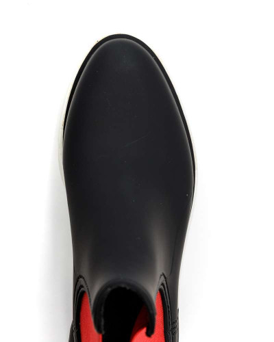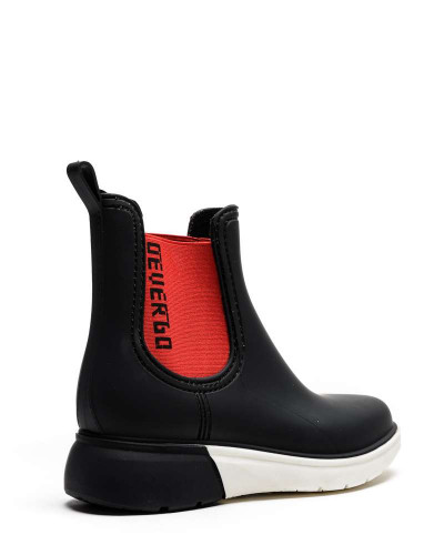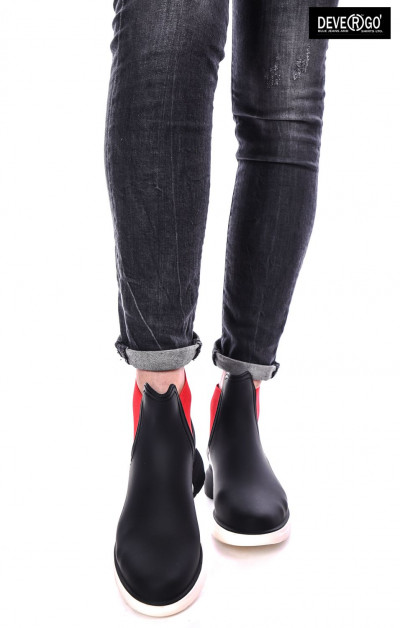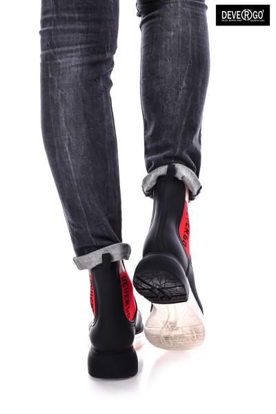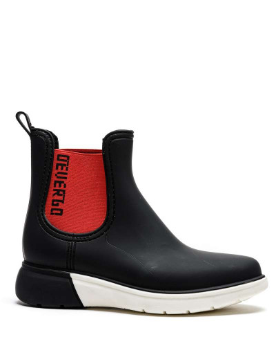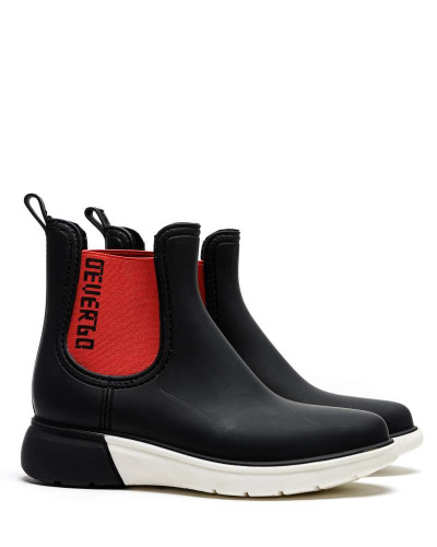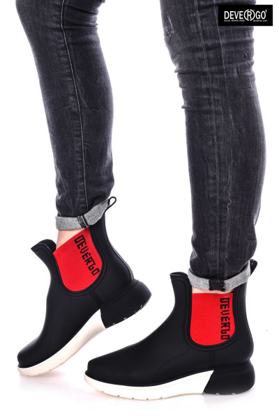 DevergoJeans női gumicsizma, fekete színben, fehér-fekete színű sportos talprésszel, oldalán elasztikus betéttel, rajta filmnyomott márkajelzéssel a tavaszi DevergoJeans kollekcióból.