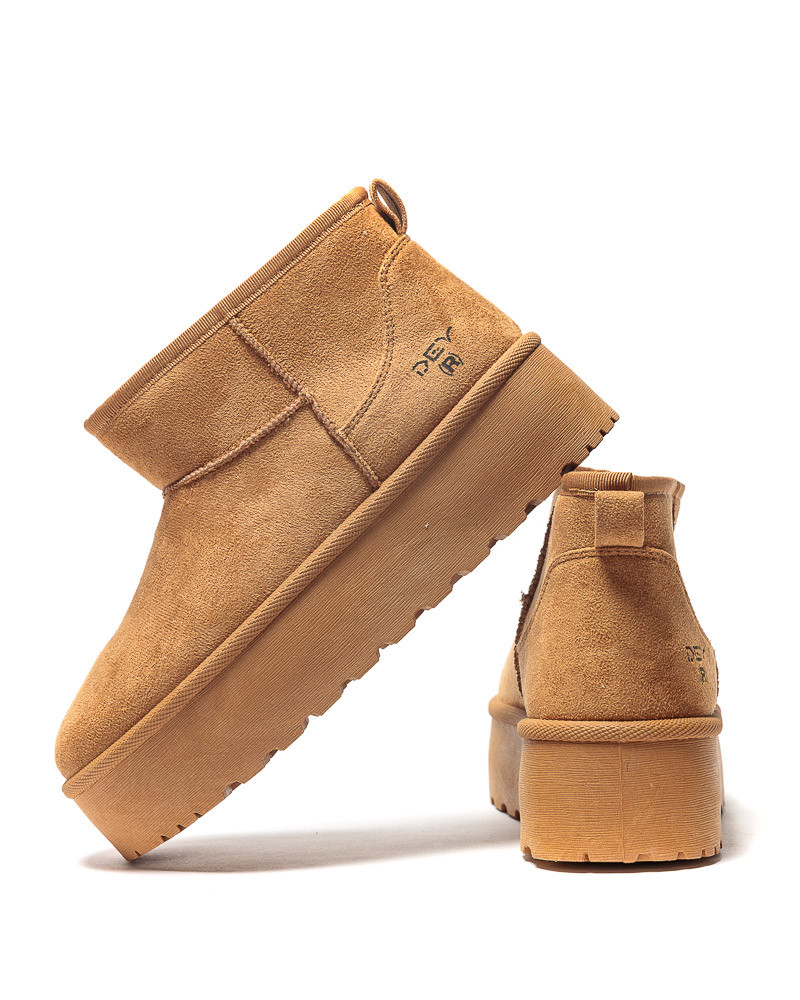 DevergoJeans női szőrme béléses hótaposó cappucinobarna színben, vastag dióbarna színű talprésszel, külső oldalán nyomott márkajelzéssel.