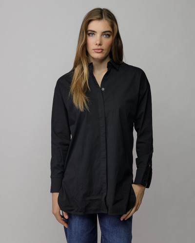 DevergoJeans bővebb fazonú, egyenes szabású, hosszított női ing, fekete színben. Elején rejtett gombolással, ejtett vállal, lekerekített és kétoldalt felsliccelt aljal, hátán diszkrét hímzett márkejelzéssel.