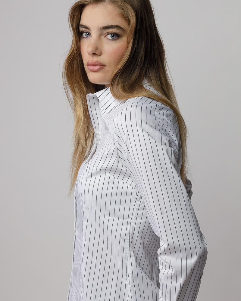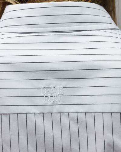 DevergoJeans normál fazonú női ing, fehér alapon fekete csíkozással. Elején gombos záródással, lekerekített aljal, hátán diszkrét hímzett márkejelzéssel.