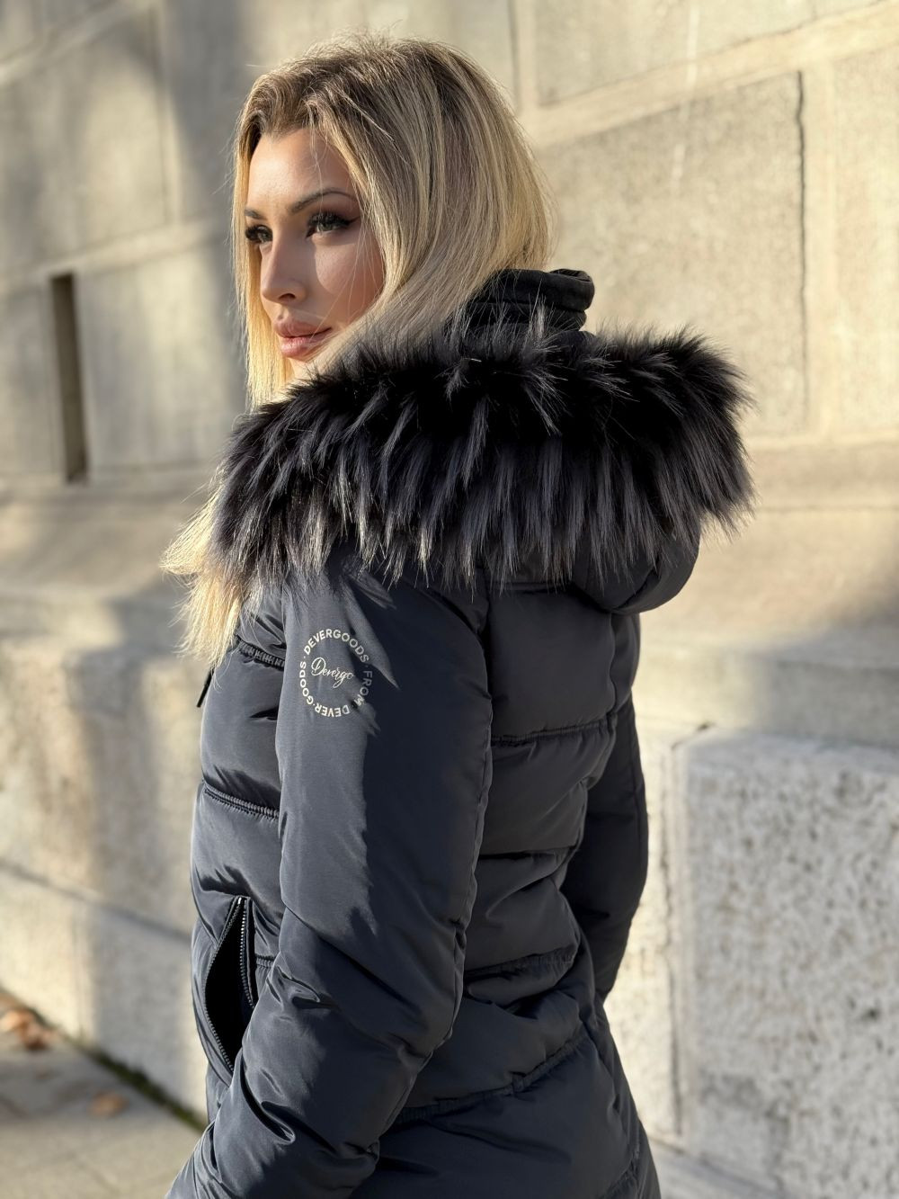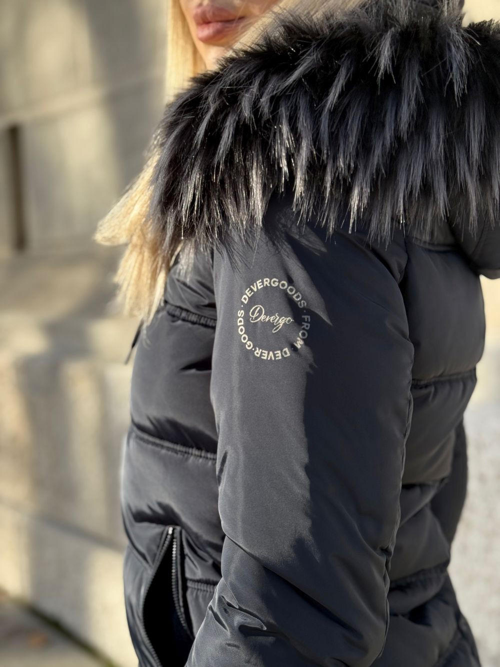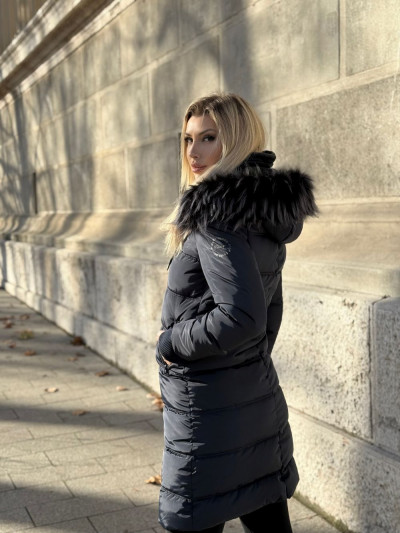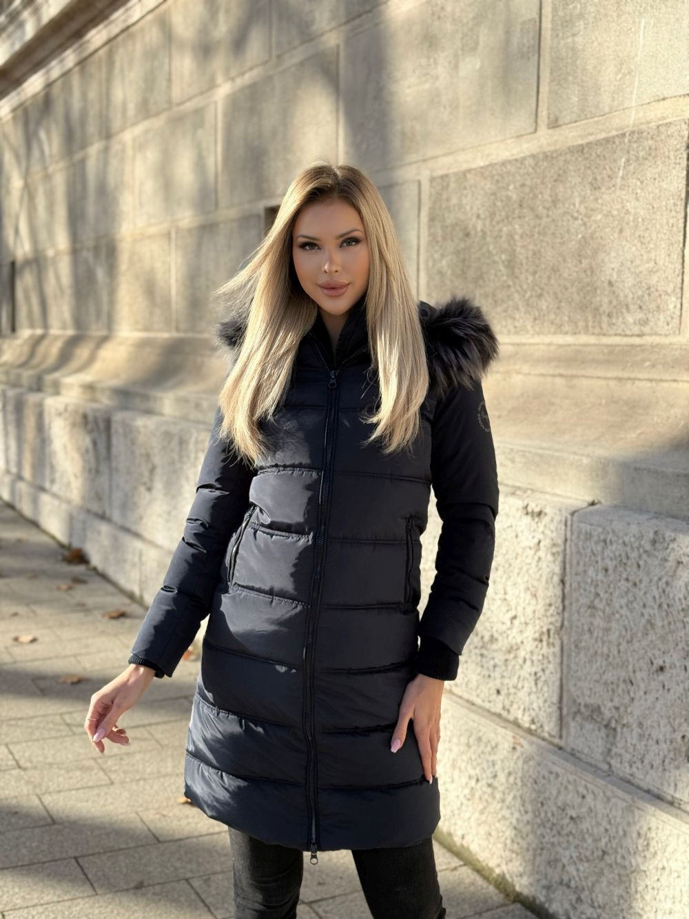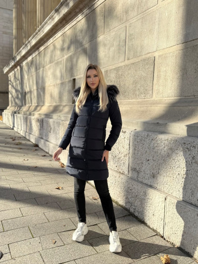 DevergoJeans női steppelt hosszú kabát, sötétkék színben, magasított nyakrésszel, húzózsinórral elátott fix kapucnival és aljjal, elején cipzáras záródással, cipzáros oldalzsebekkel, gumírozott kézelővel, márkajelzett fémkellékekkel, ujján és kapucniján filmnyomott márkajelzéssel.