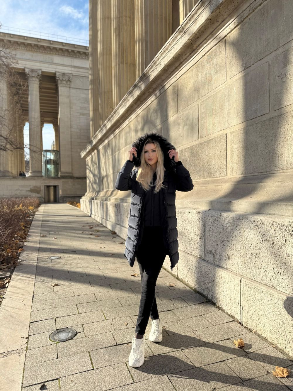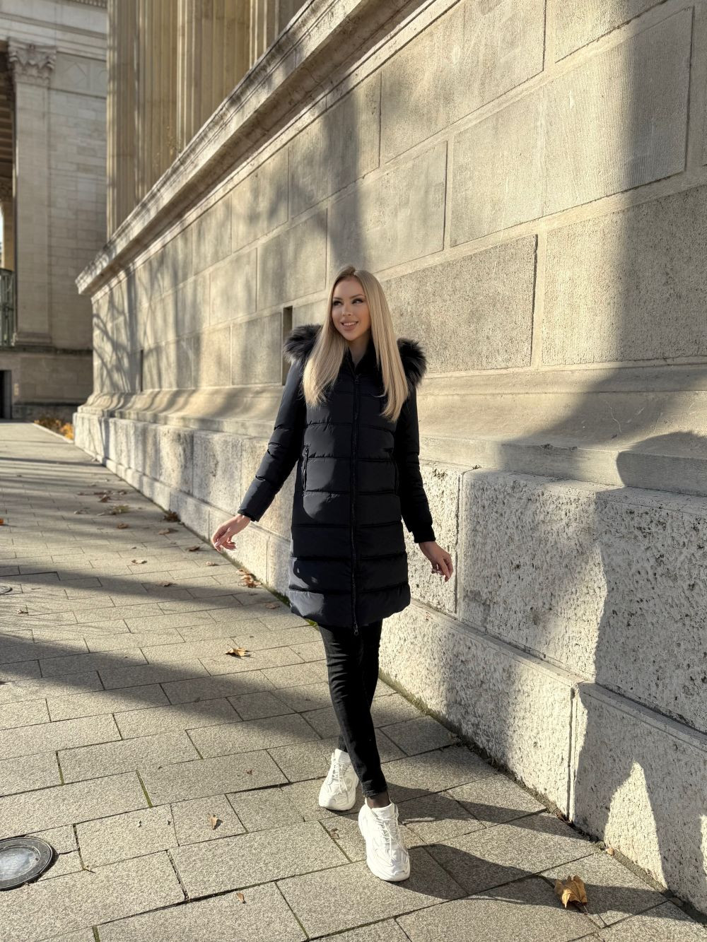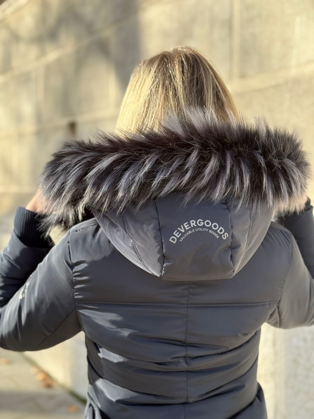 DevergoJeans női steppelt hosszú kabát, sötétkék színben, magasított nyakrésszel, húzózsinórral elátott fix kapucnival és aljjal, elején cipzáras záródással, cipzáros oldalzsebekkel, gumírozott kézelővel, márkajelzett fémkellékekkel, ujján és kapucniján filmnyomott márkajelzéssel.