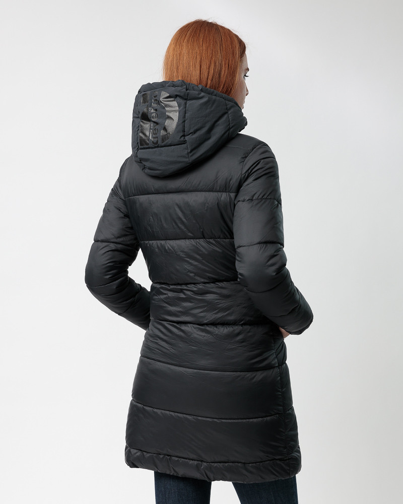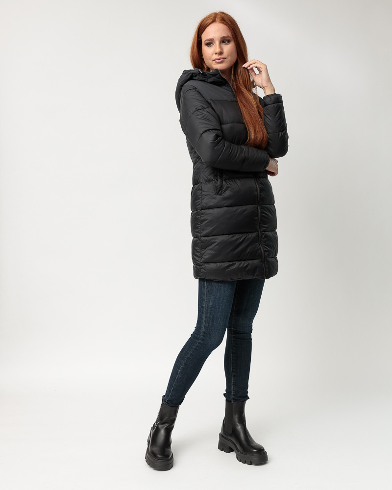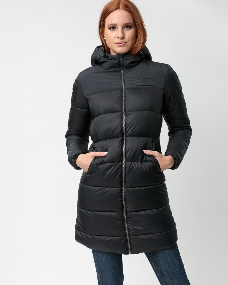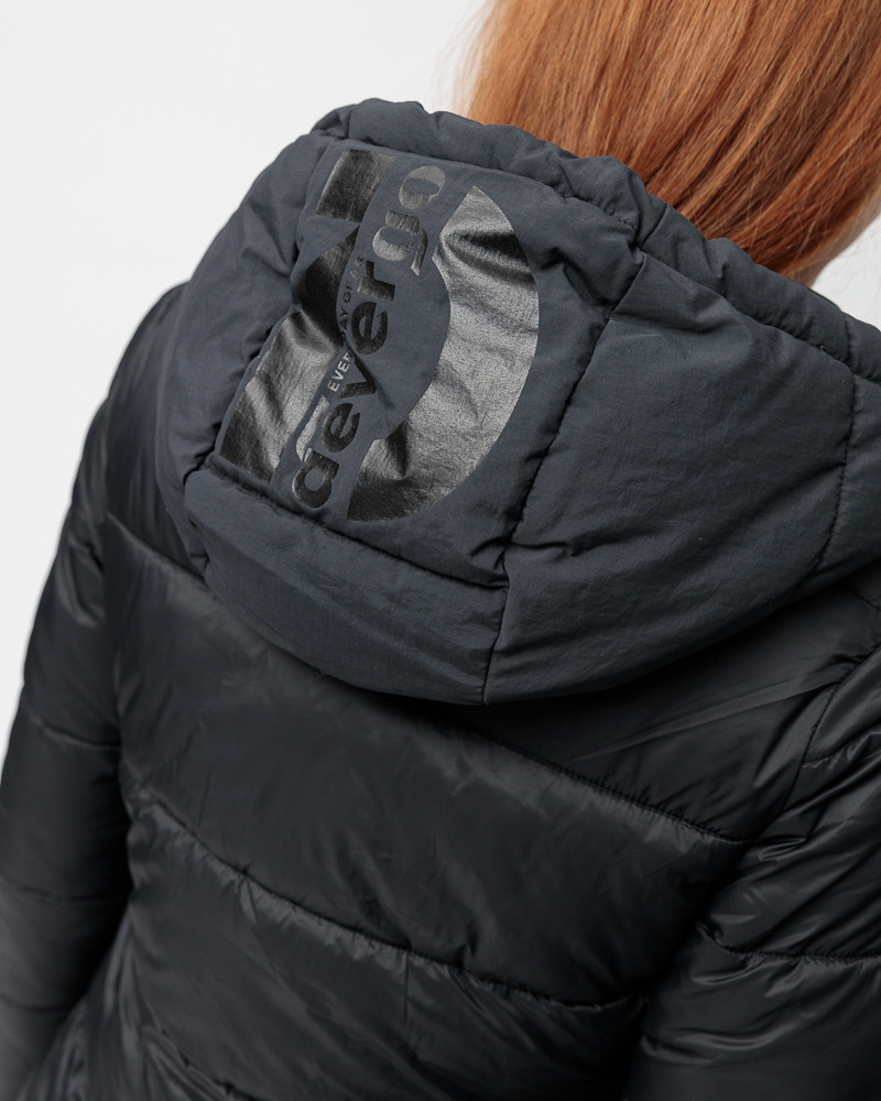 DevergoJeans karcsúsított fazonú, steppelt kabát fekete színben; rögzített kapucnival; elejében zipzáros záródással; oldalzsebekkel; mell részén rávarrt szilikon márkajelzéssel az őszi/téli DevergoJeans kollekcióból.