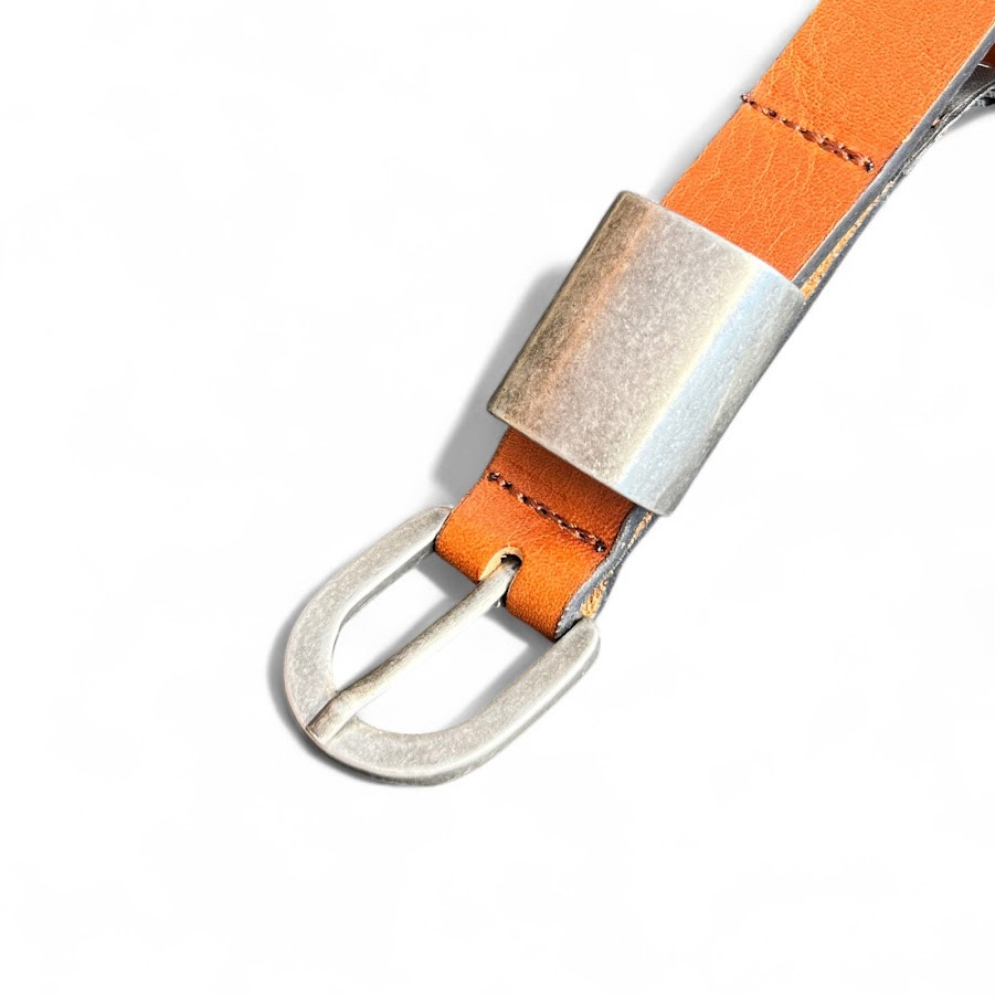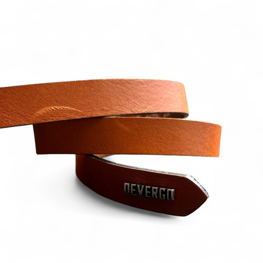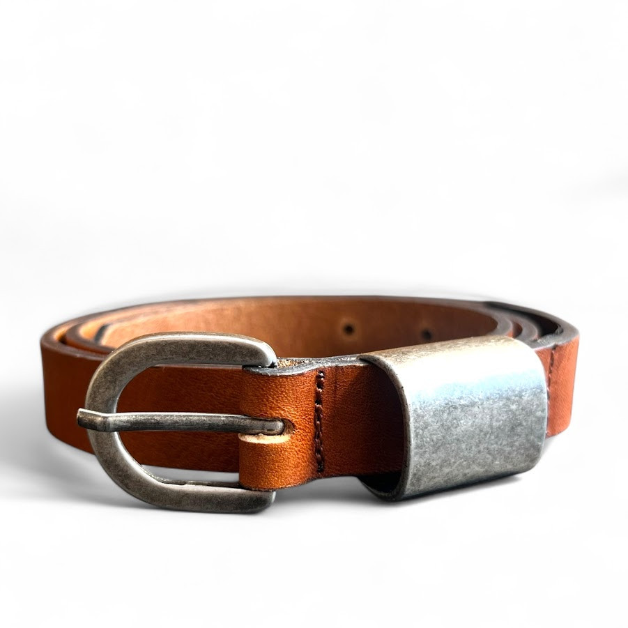 DevergoJeans női vékony bőr öv, mogyoróbarna színben, antikolt nikkel színű fém csattal, fém márkajelzéssel.