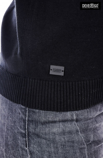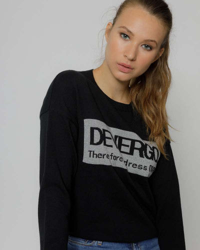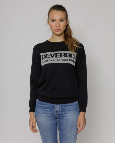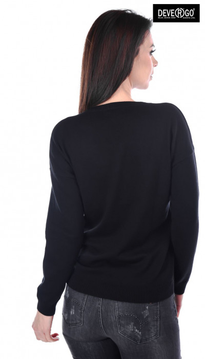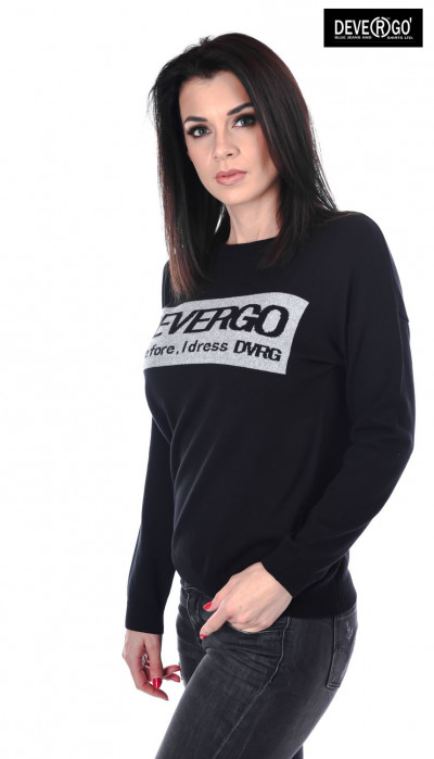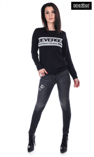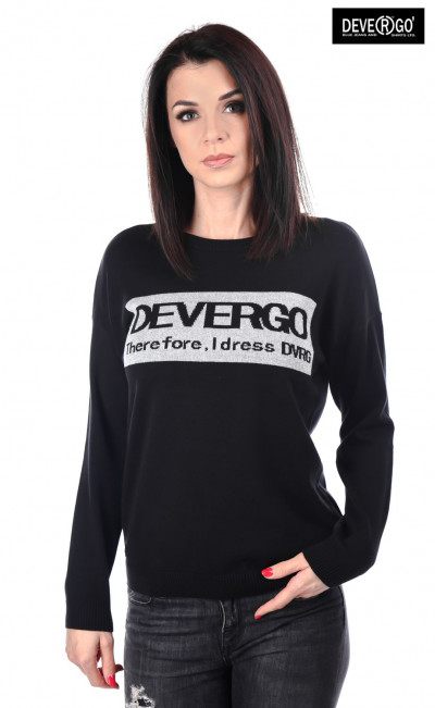 DevergoJeans női vékony kötött pulóver, fekete színben, bordázott passzékkal, mell részén lurex szálas háttérben, - alján rávarrt szilikon márkajelzéssel az őszi DevergoJeans kollekcióból.