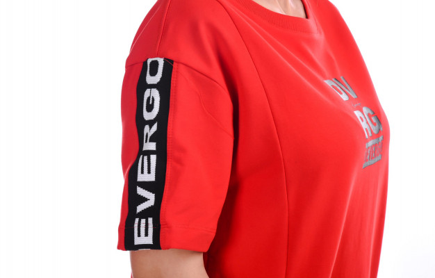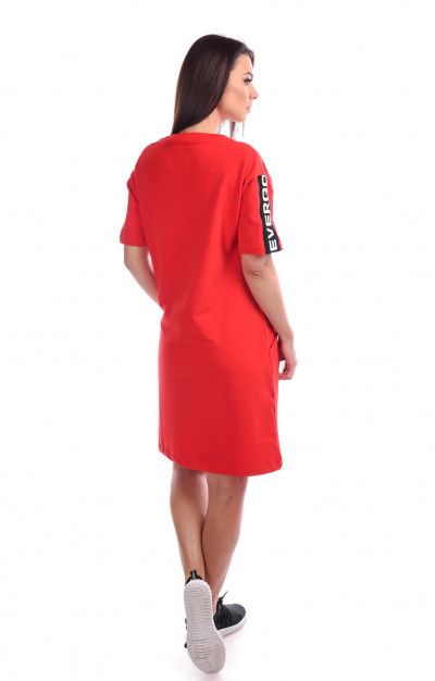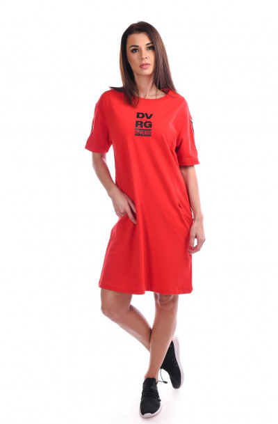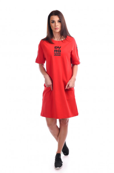 DevergoJeans női pólóruha, piros színben, oldalzsebekkel, ujján anyagában, mell részén filmnyomott márkajelzéssel a tavszi DevergoJeans kollekcióból.