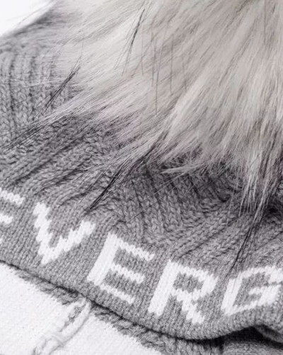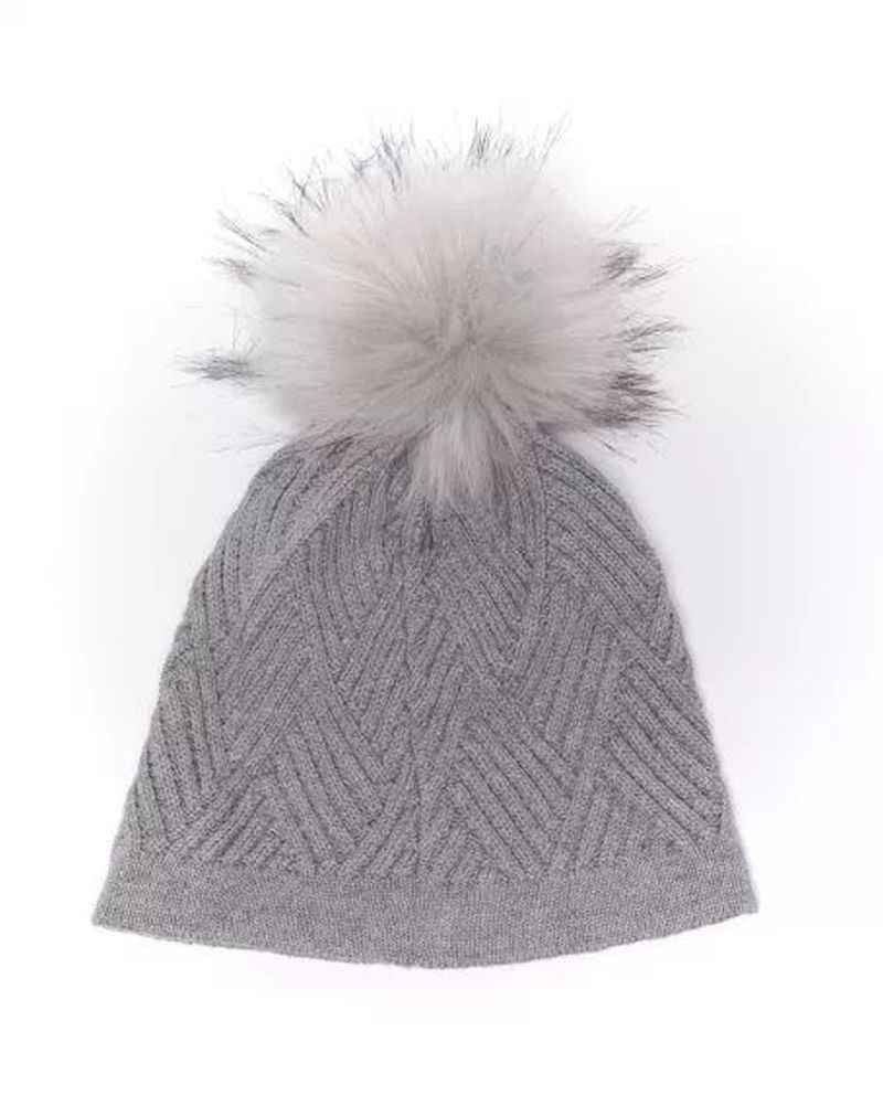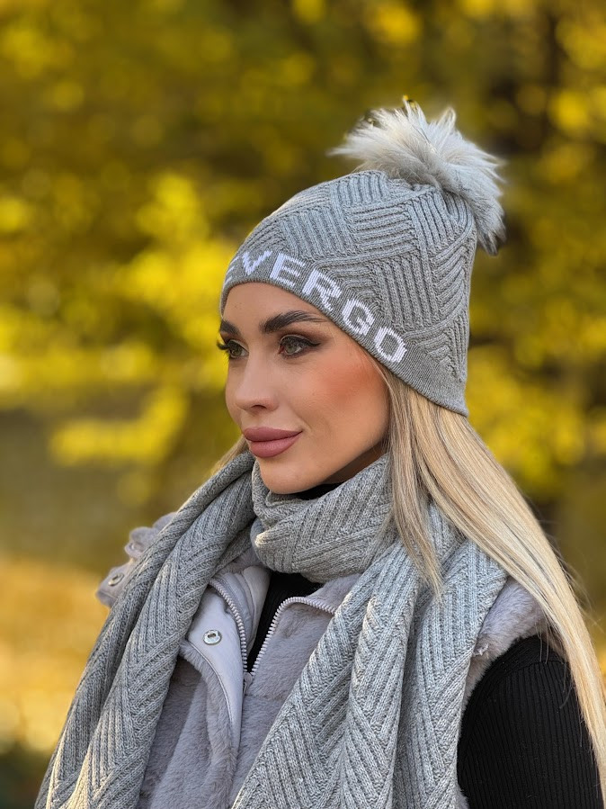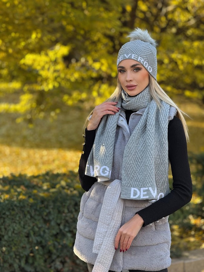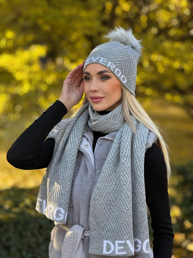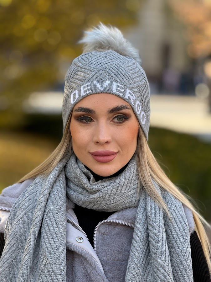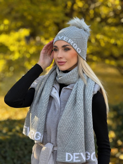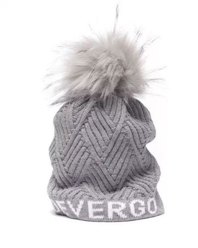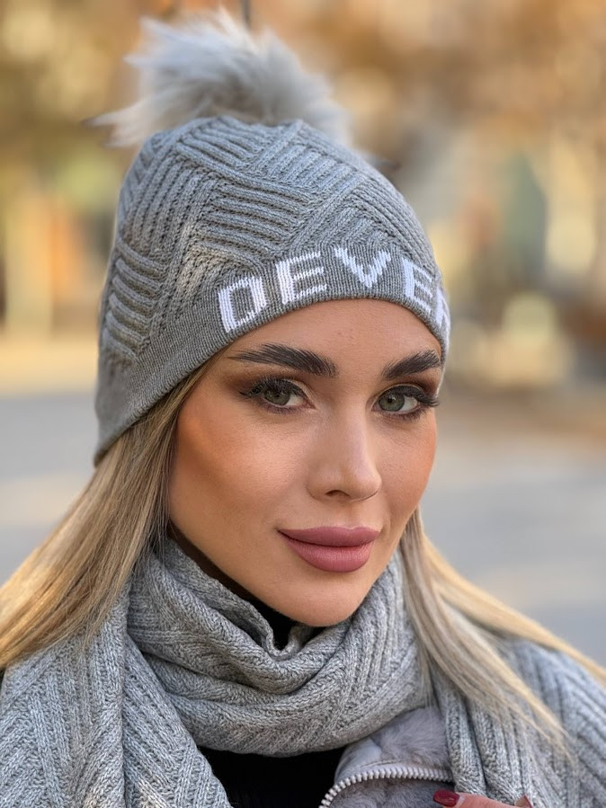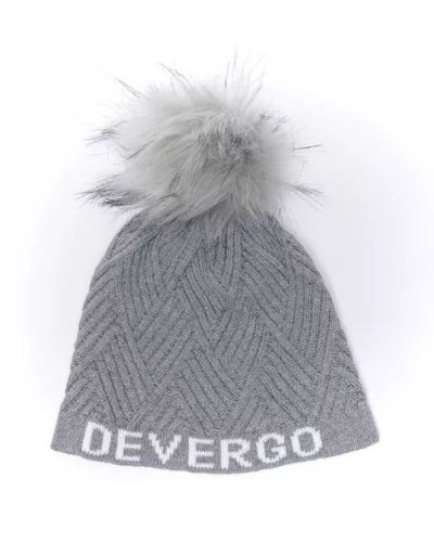 DevergoJeans női kötött bojtos sapka, szürke színben, anyagában márkajelzéssel.