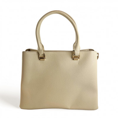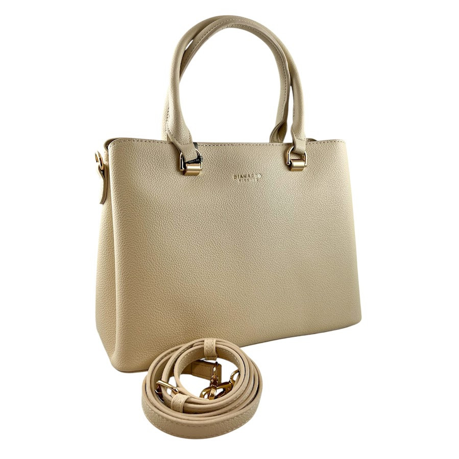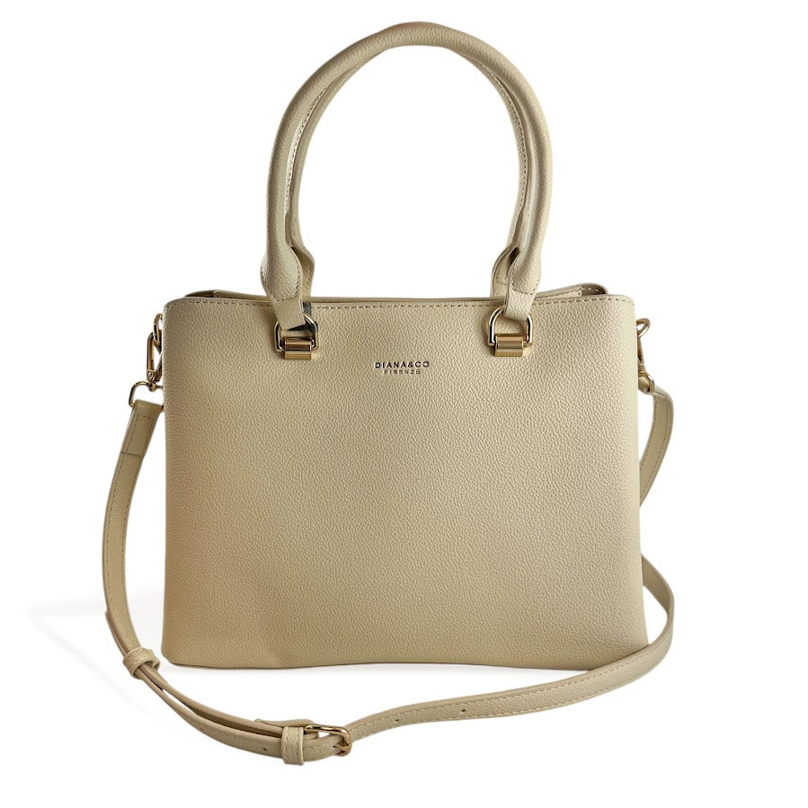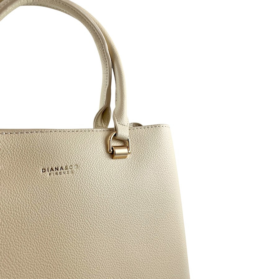 Diana&Co női oldaltáska, vaj színű bőrhatású anyagból, egy fix és egy lecsatolható, állítható pánttal, patentos és cipzáras záródással, három terű belsőrésszel, benne cipzáras zsebbel és rekesszel, arany színű fémkellékekkel, elején nyomott márkajelzéssel.