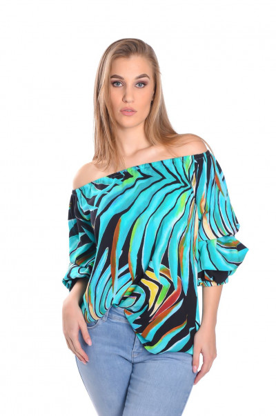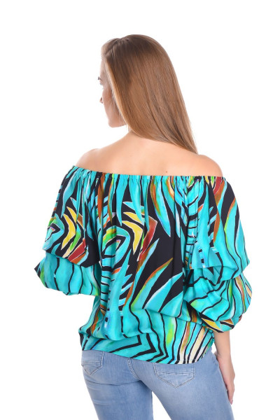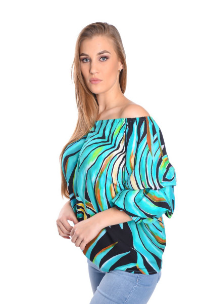 Envy Fashion női blúz, zöld mintás, ejtett vállú húzott ujjú.