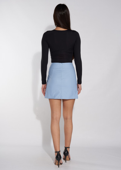 Envy Fashion női mini műbőr szoknya, világoskék színben, elején átlapolt díszítéssel, oldalán svéd zsebekkel, derekán fém csatokkal.