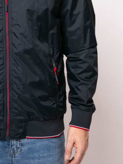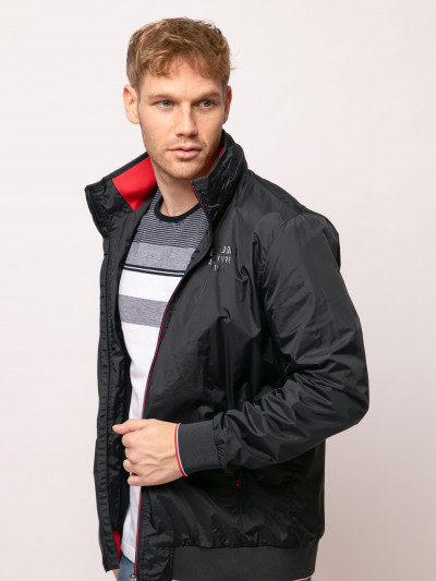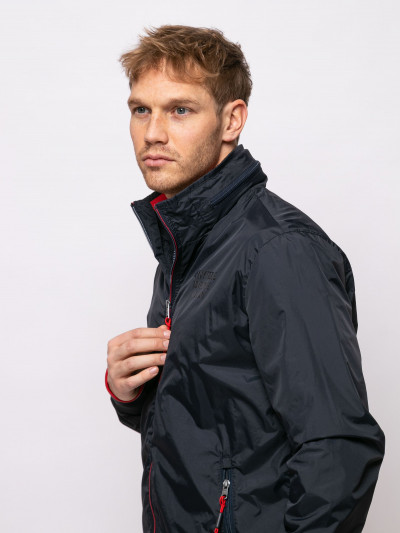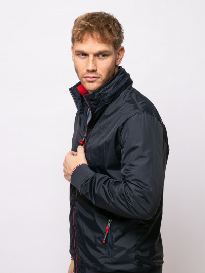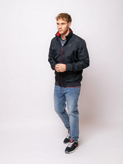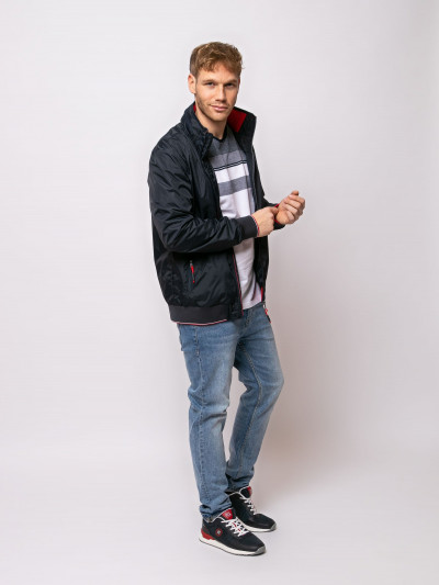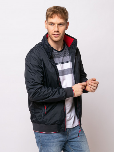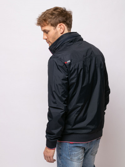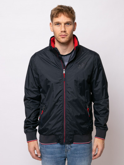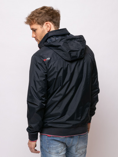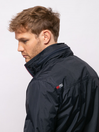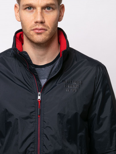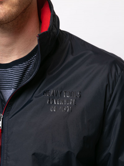 Heavy Tools férfi dzseki, sötétkék színben, magasított nyakkal benne rejtett kapucnival, elején cipzáras záródással és cipzáras oldalzsebekkel, elején szilikon márkajelzéssel a tavaszi Heavy Tools kollekcióból.