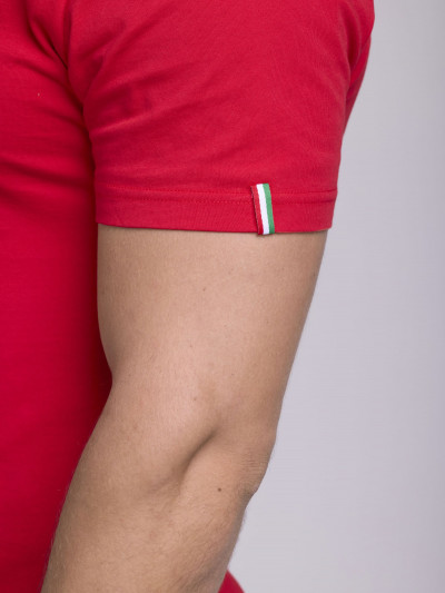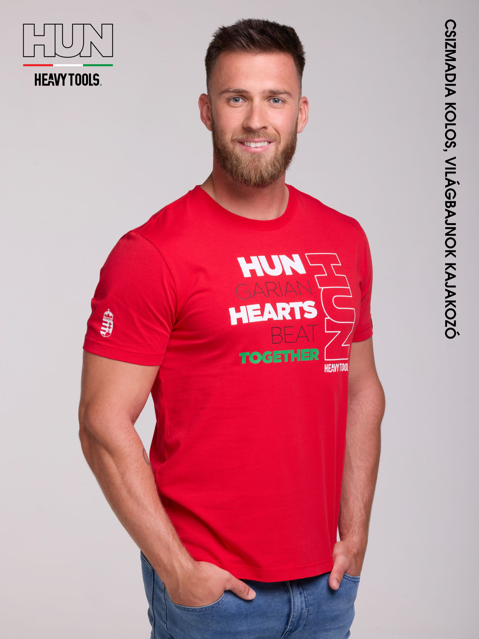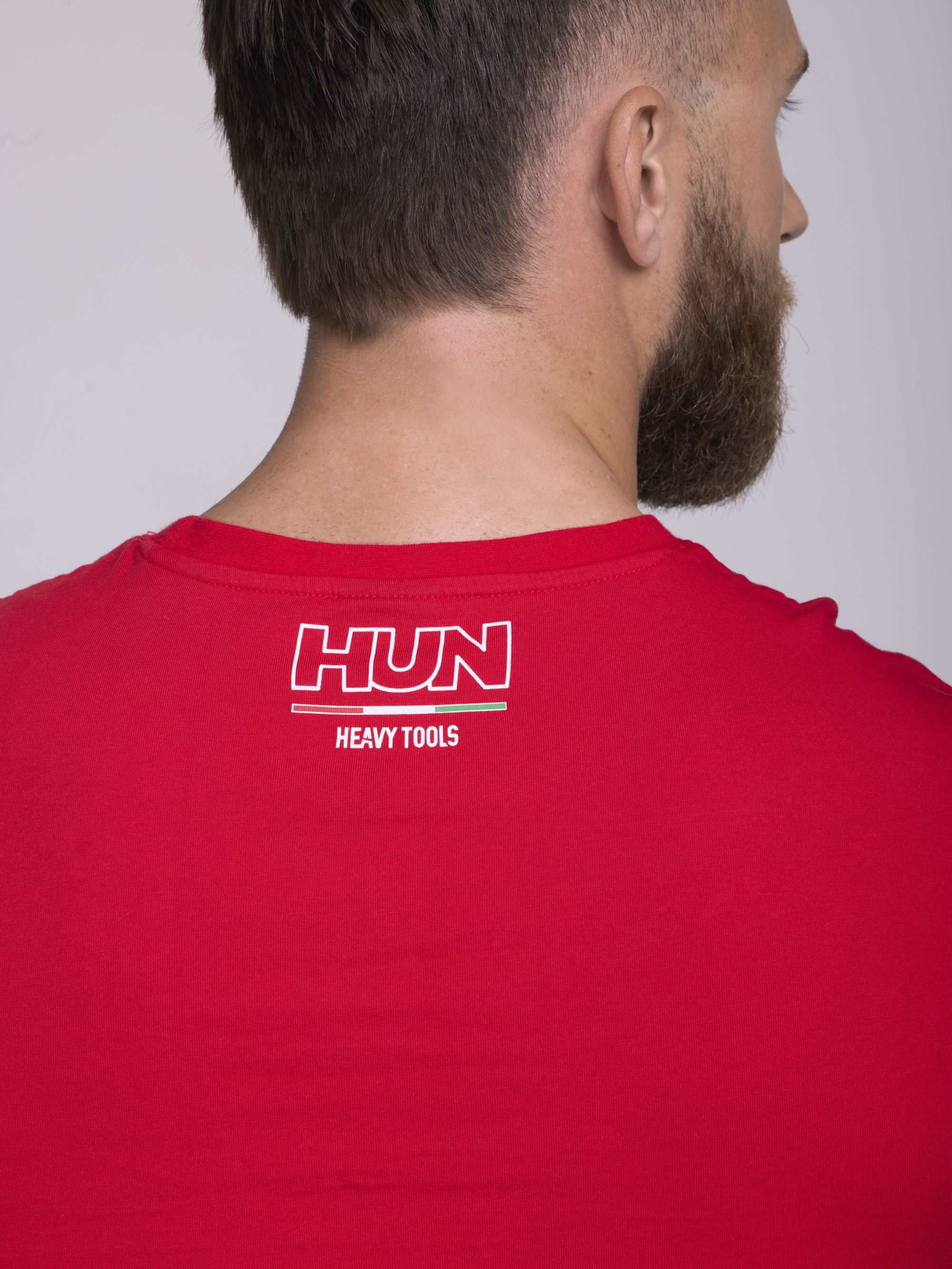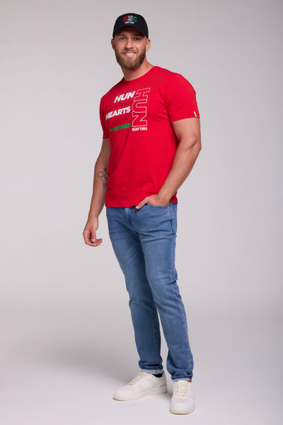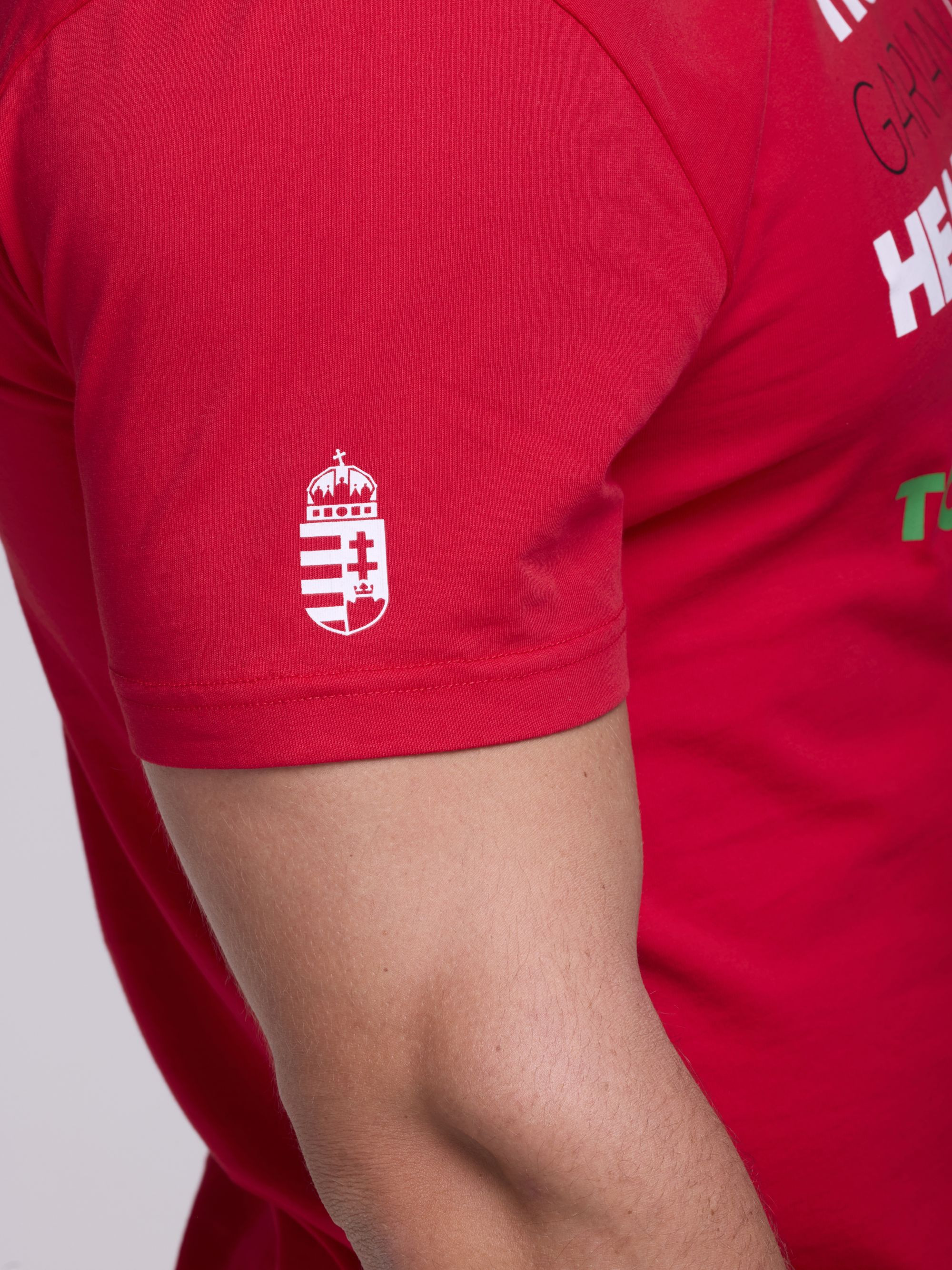 Heavy Tools szurkolói férfi póló, egyenes szabással, piros színben, kerek nyakkivágással, tiszta pamut anyagból, nagy nyomott, nemzeti színű felirattal az elején, nemzeti nyomással és kis márkajelzéssel a hátán, nemzeti címerrel a jobb ujján, nemzeti szalaggal a bal ujján.