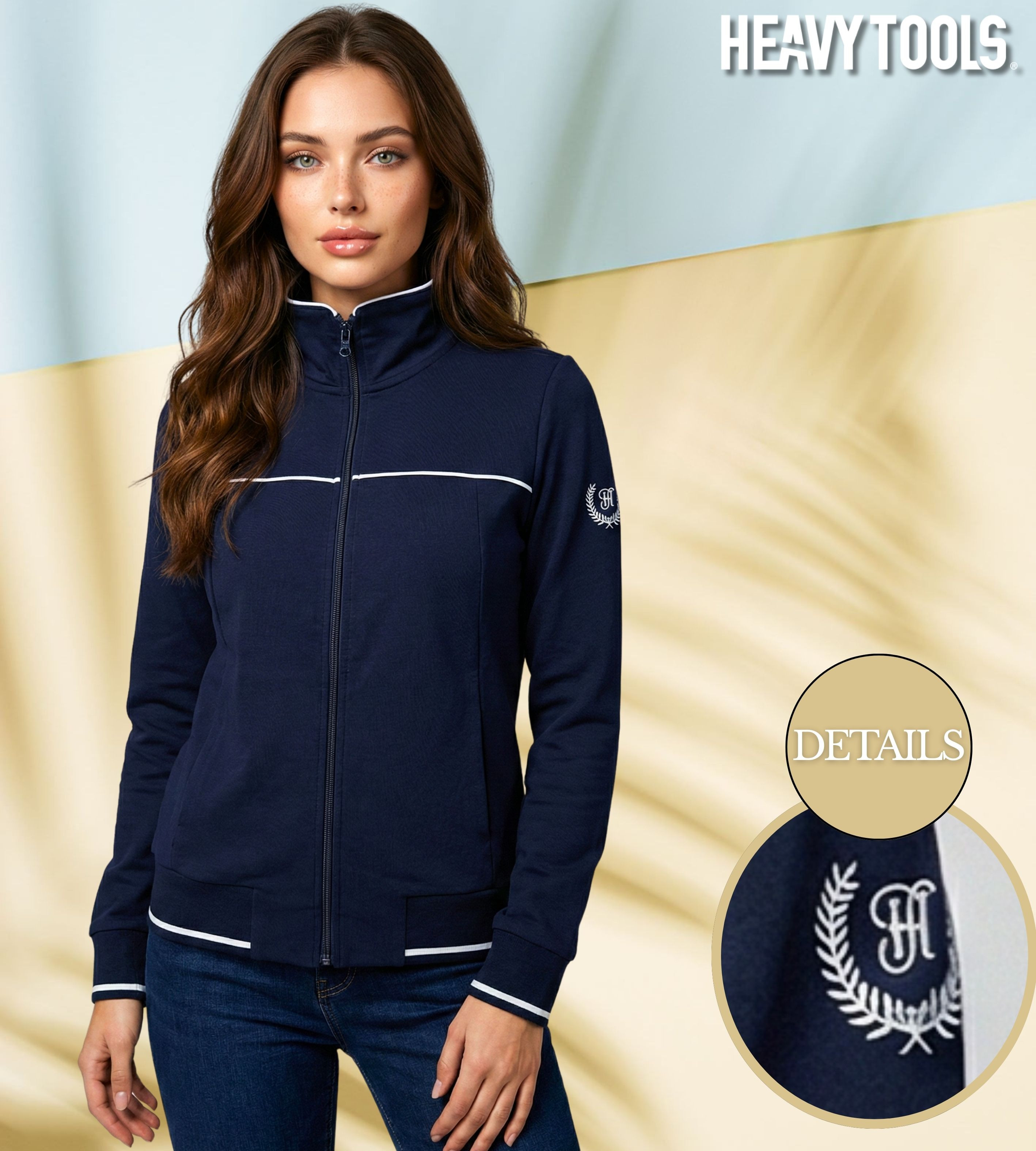 Heavy Tools női felső klasszikus szabással; tengerészkék színben; elejében zipzáros záródással; állónyakkal; bordáskötött passzés aljjal és kézelővel; oldalzsebekkel; dekoratív szabásvonalakkal; vállán hímzett márkajelzéssel.