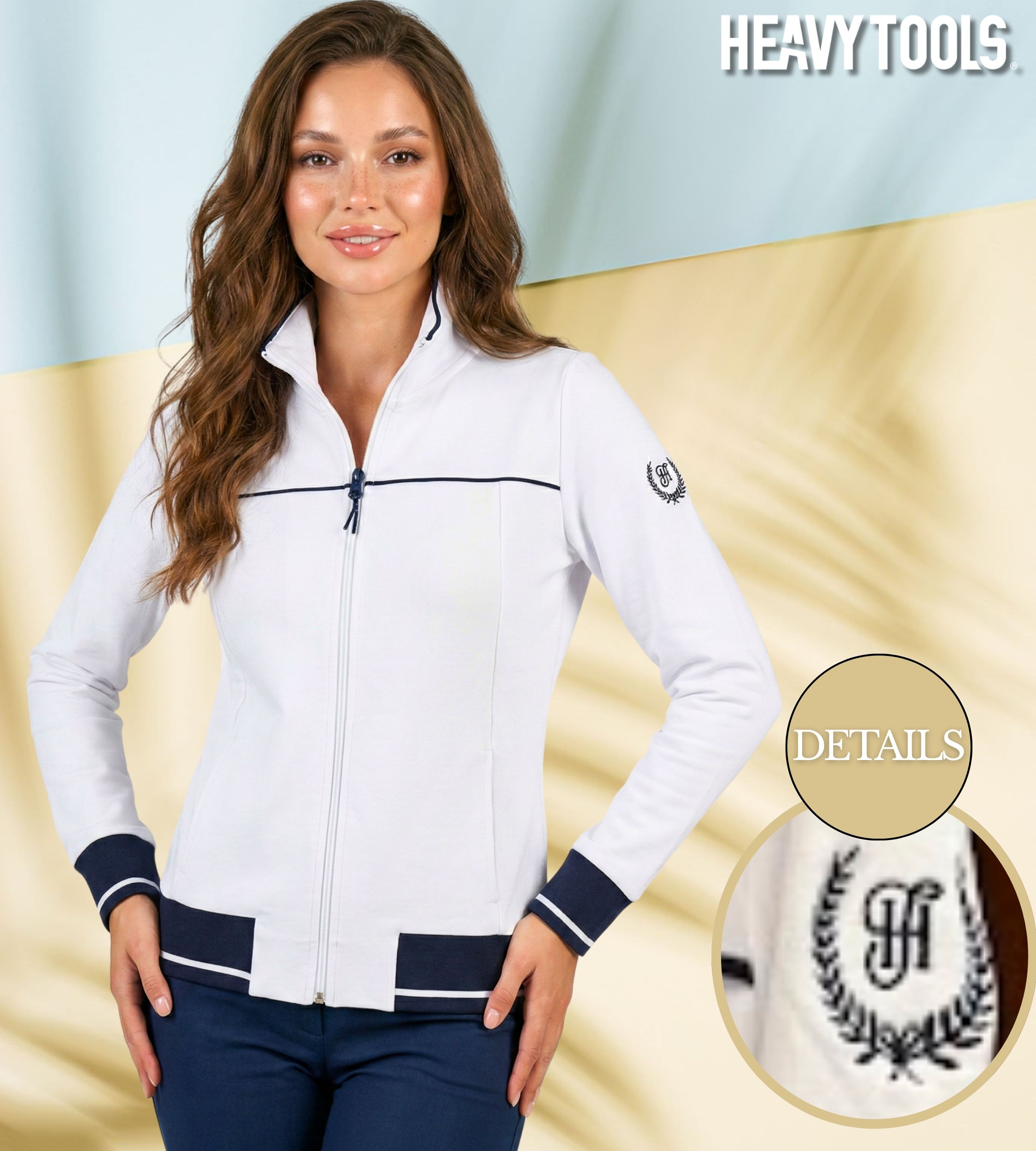 Heavy Tools női felső klasszikus szabással; fehér színben; elejében zipzáros záródással; állónyakkal; bordáskötött passzés aljjal és kézelővel; oldalzsebekkel; dekoratív szabásvonalakkal; vállán hímzett márkajelzéssel.