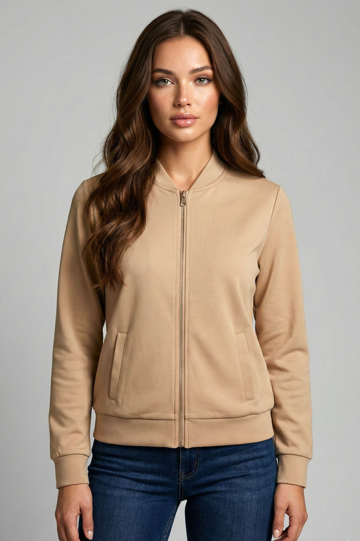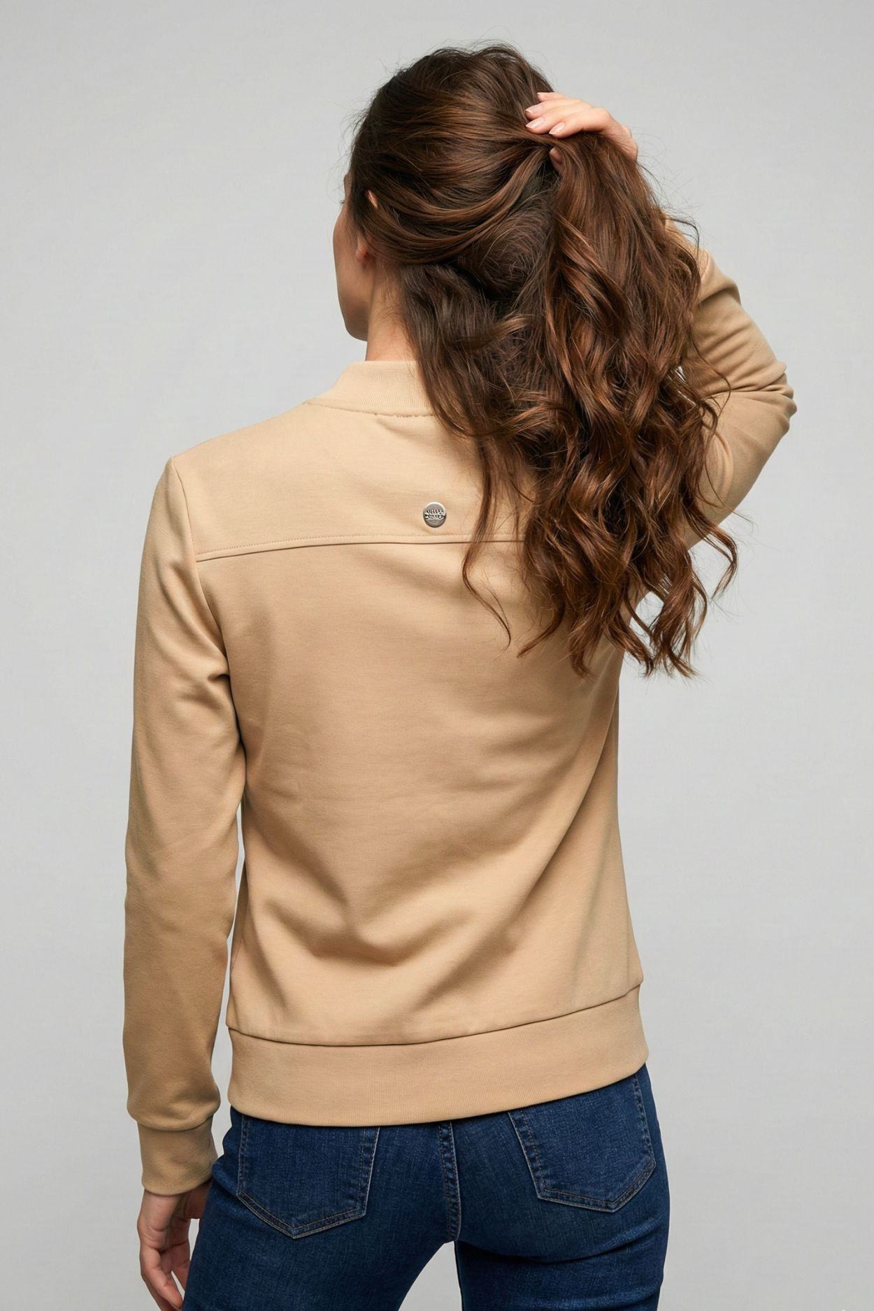Heavy Tools női felső klasszikus szabással; elejében zipzáros záródással; pici állónyakkal; sötétbézs színben; bordáskötött passzés aljjal és kézelővel; oldalzsebekkel; oldalába varrott kisméretű textil márkajelzéssel.