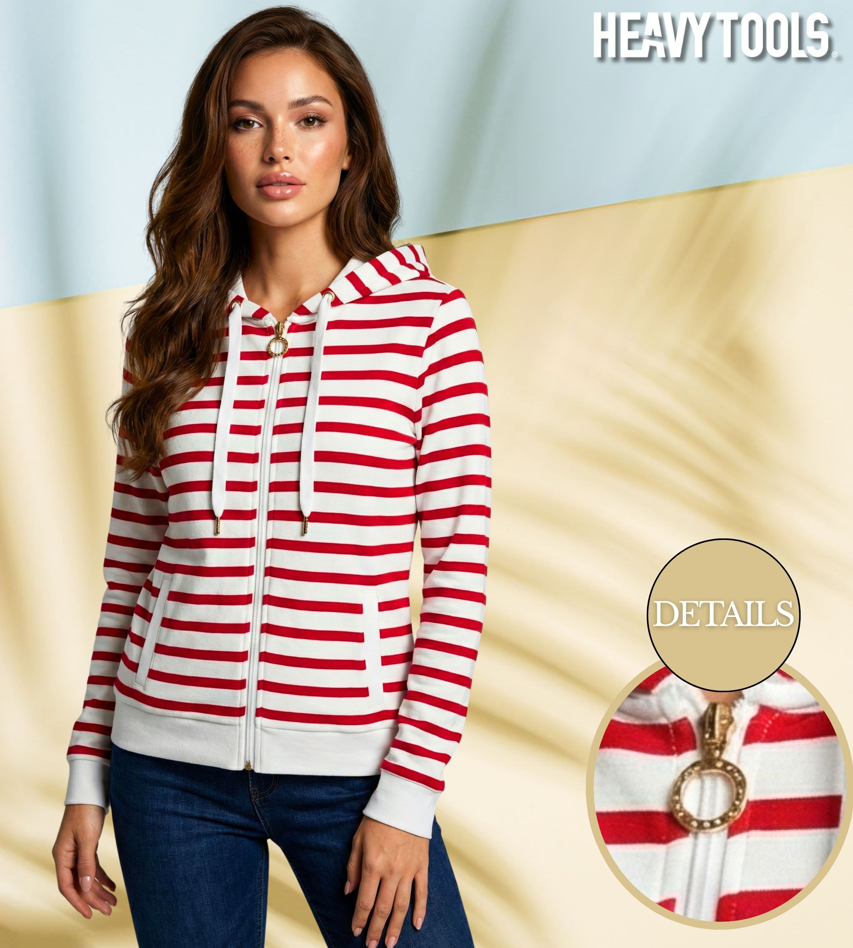 Heavy Tools női felső klasszikus szabással; elejében zipzáros záródással; húzózsinóros kapucnival; piros és ekrü színű csíkozással; passzés aljjal és kézelővel; oldalzsebekkel; márkajelzett fém kekészítőkkel.