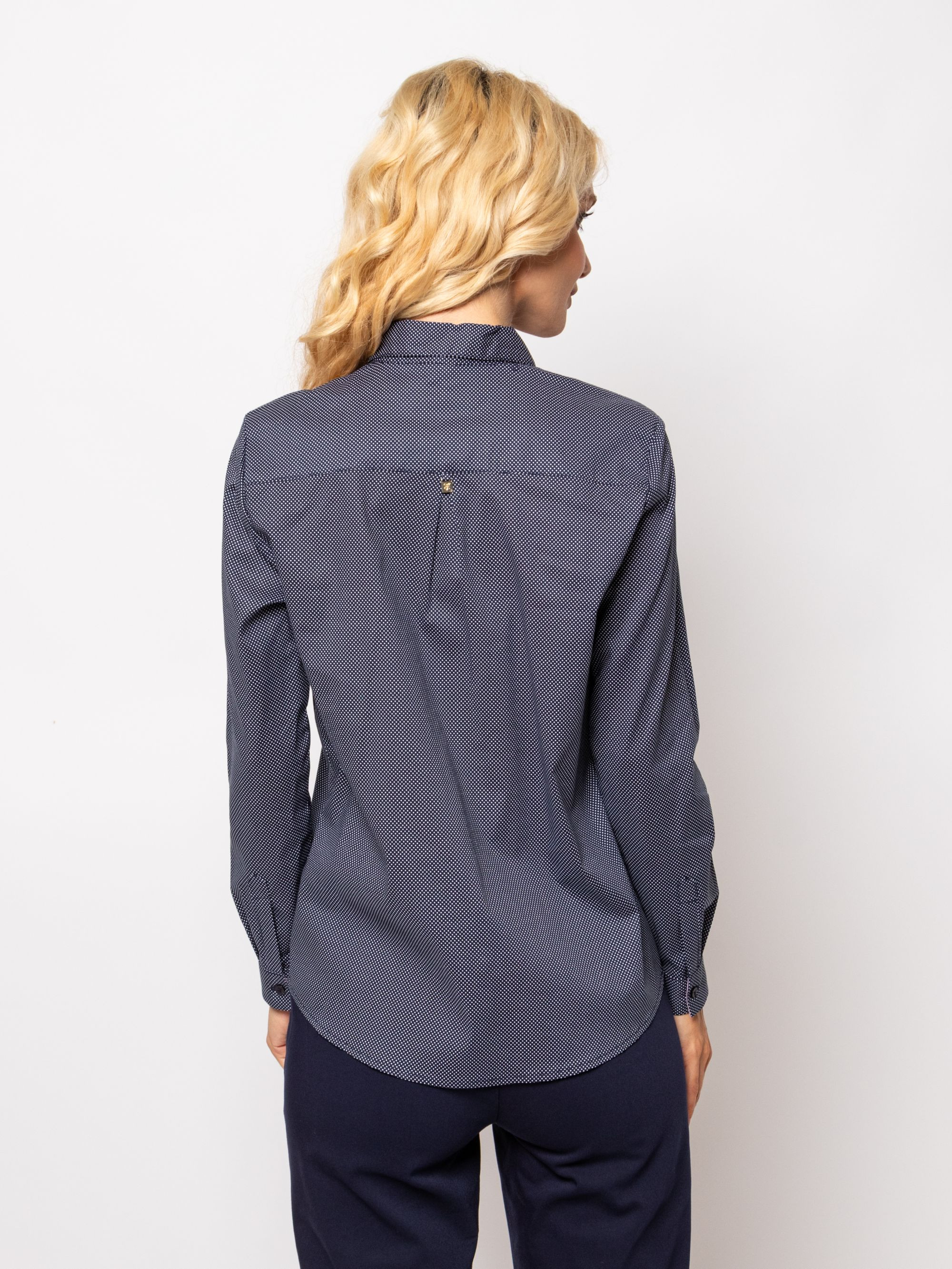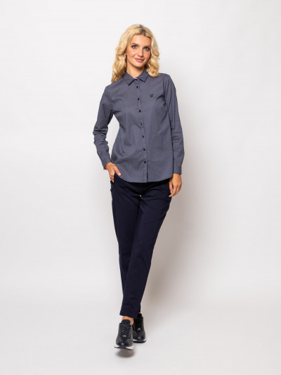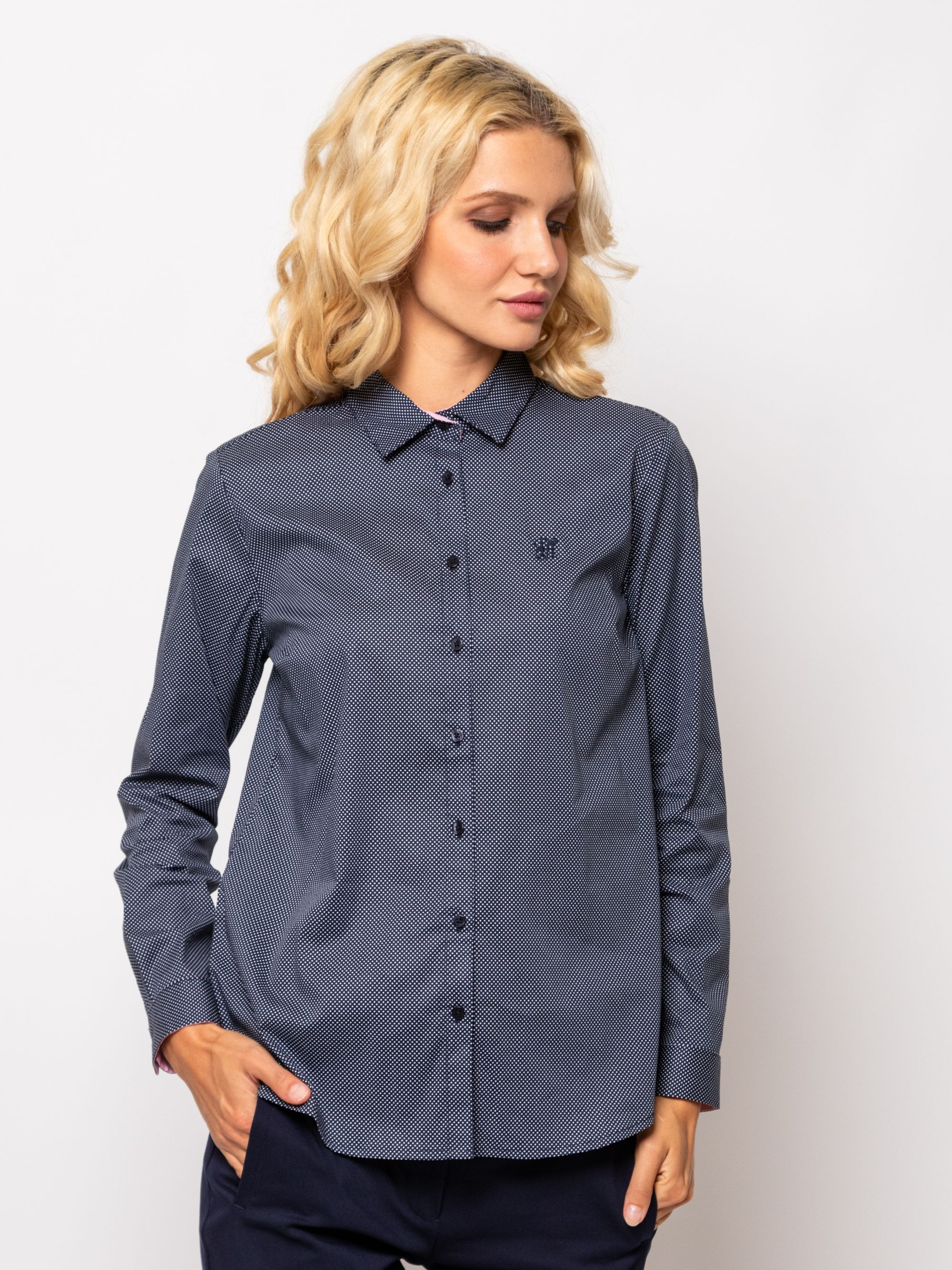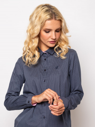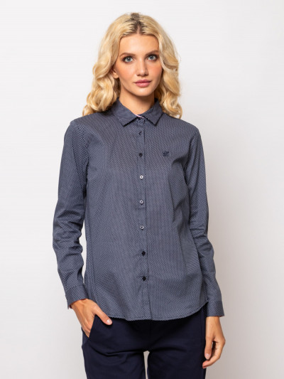 Heavy Tools karcsúsított szabású női ing, sötétkék színben apró fehér mintával, gombos kézelővel, mell részén hímzett- hátán fém márkajelzéssel.