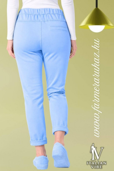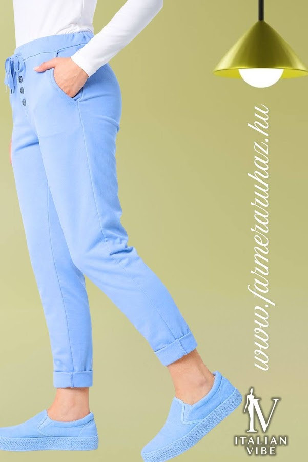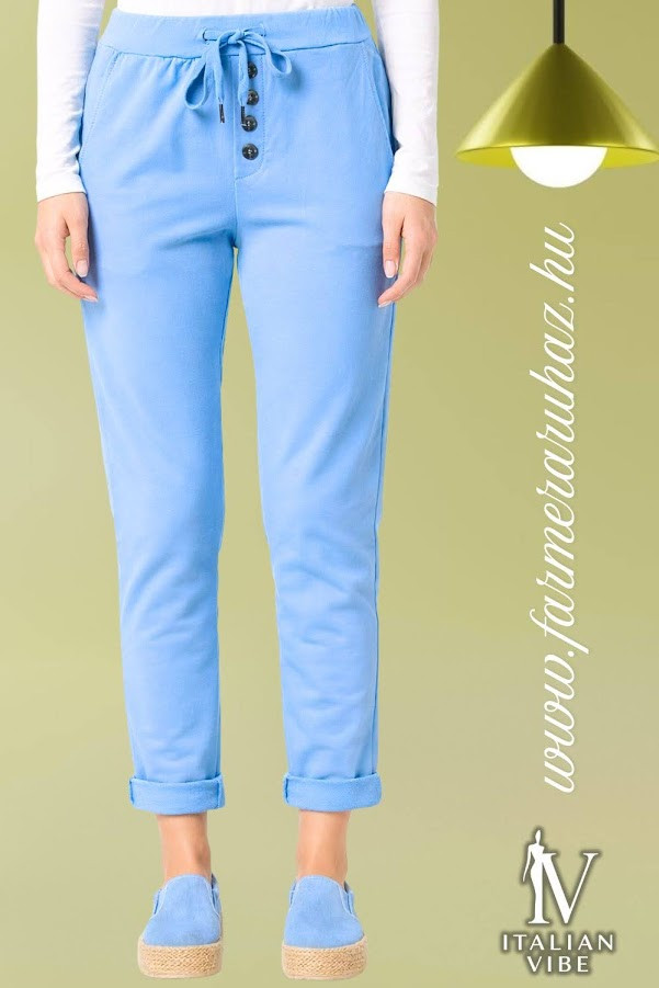 Italian Vibe női gombos pamut nadrág, világoskék színben, elasztikus és húzózsinóros derékrésszel, svédzsebekkel, álfarzsebbel, enyhén szűkülő szárral.