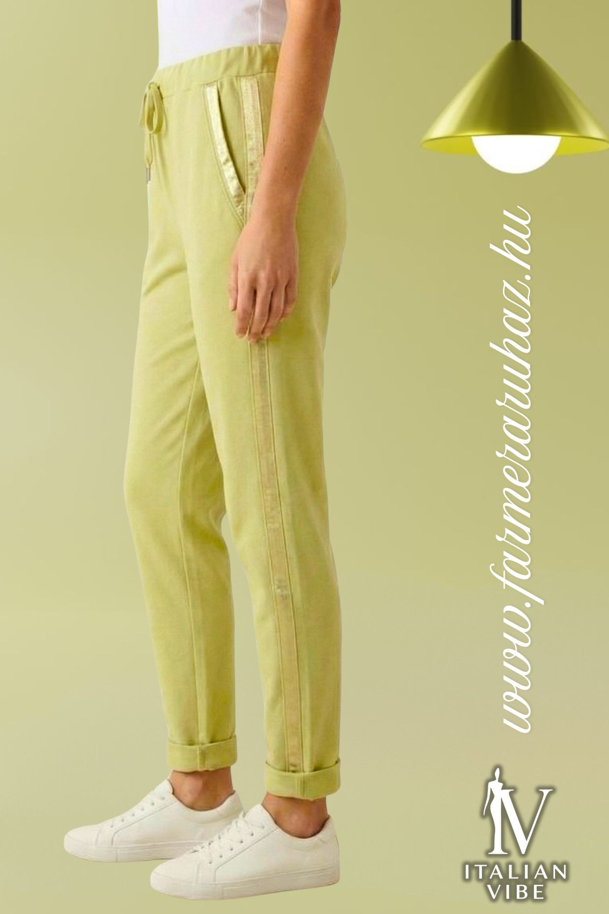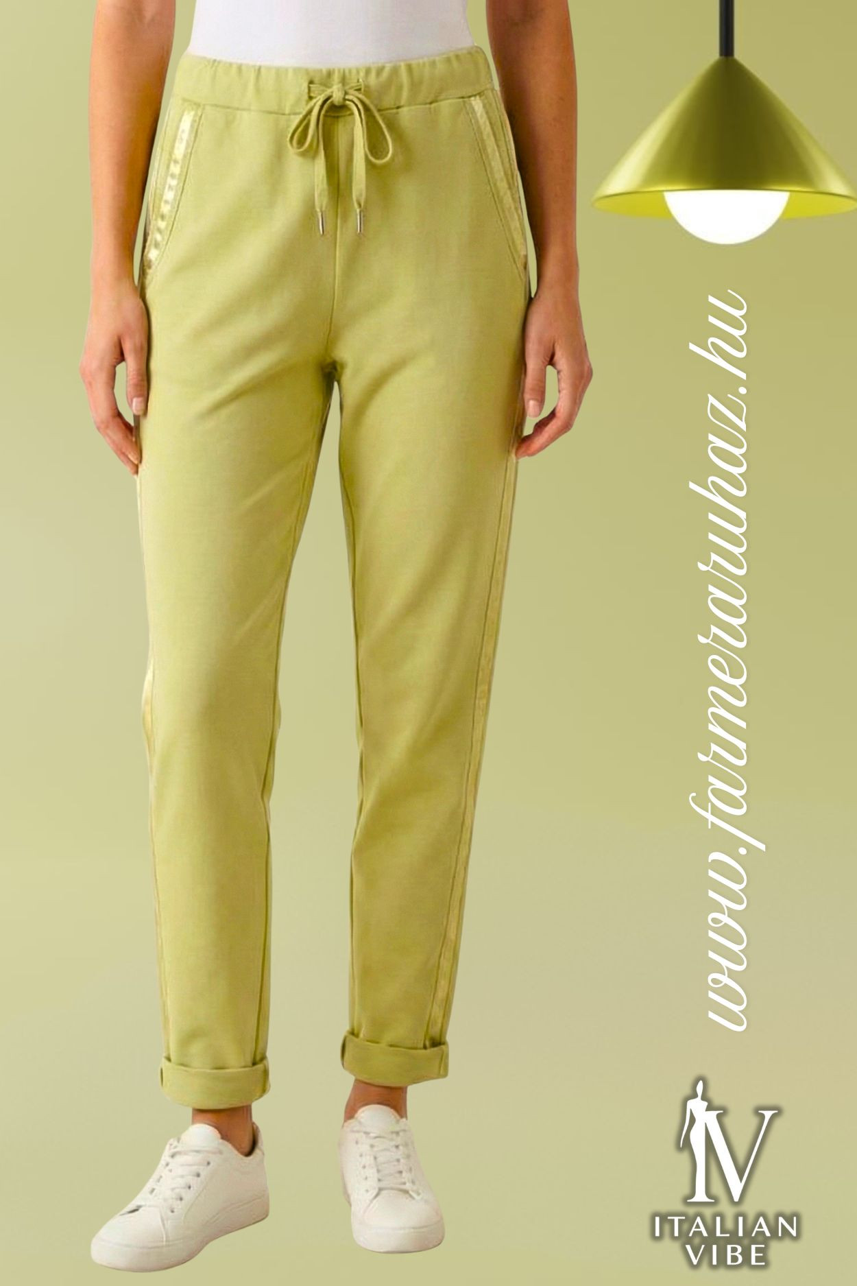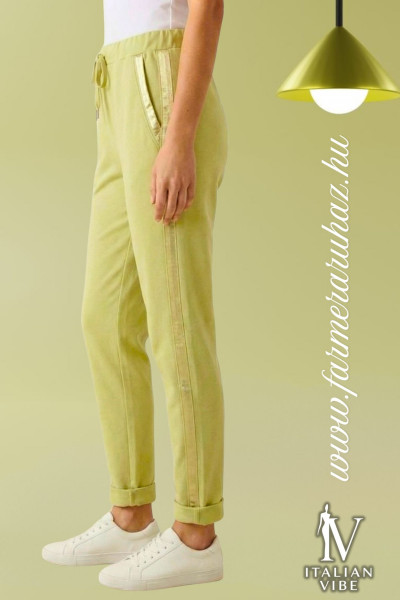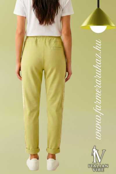 Italian Vibe női szatén csíkos pamut nadrág, pisztácia színben, gumírozott és húzózsinóros derékrésszel, svédzsebekkel, álfarzsebbel, enyhén szűkülő szárral.