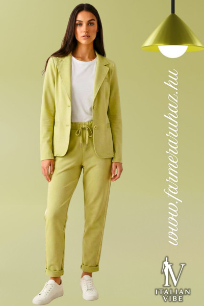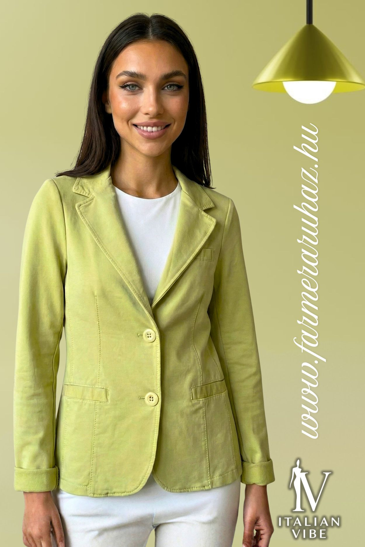 Italian Vibe női pamut zakó, pisztáciazöld színben, egyenes szabással, bevágott csúcsos hajtókával, gombos záródással, díszzsebekkel.