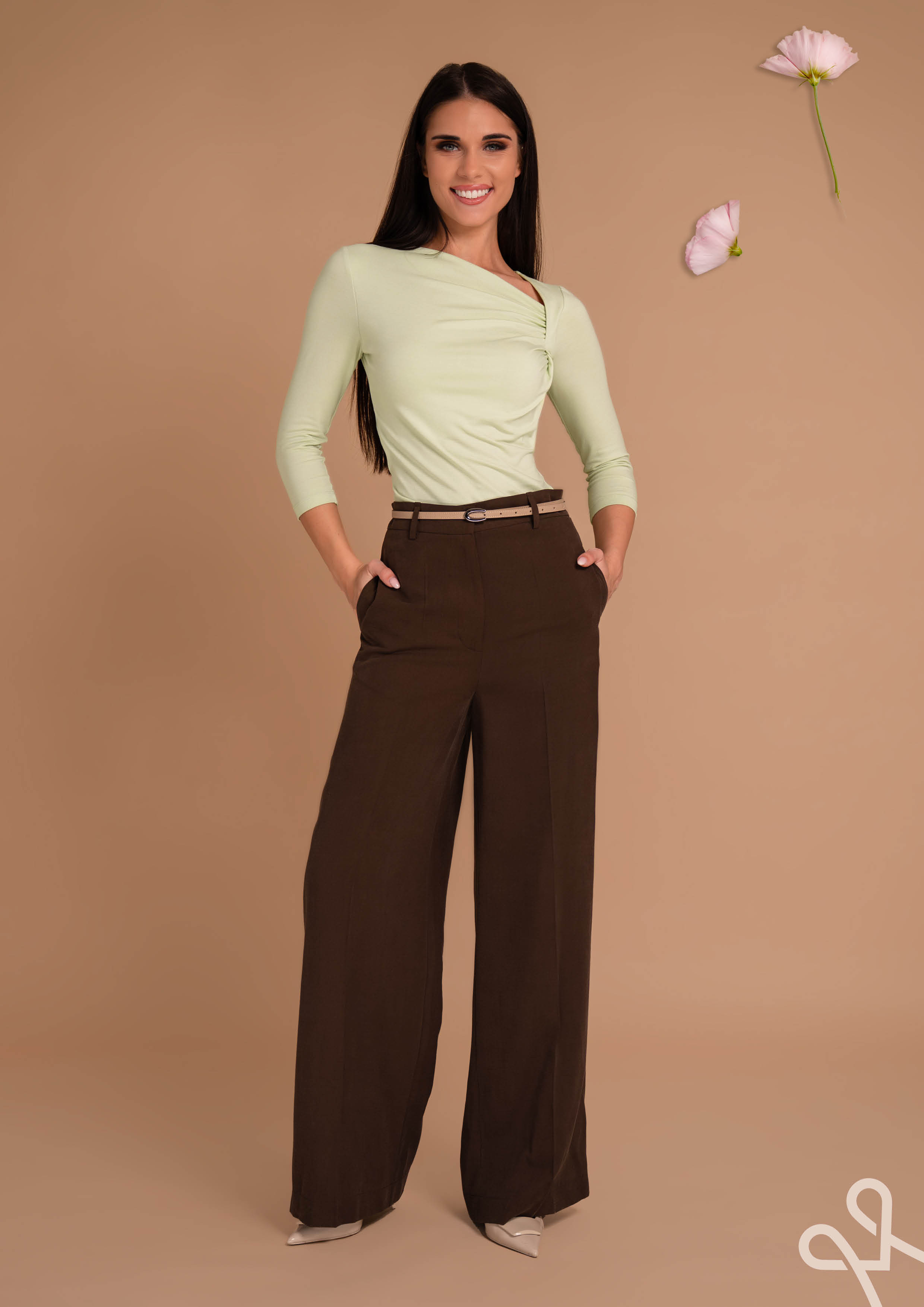 Magenta elasztikus viszkóz felső, pasztell zöld színben, elején húzott megoldással, 3/4 ujjhosszal, hátul filmnyomott márkajelzéssel.