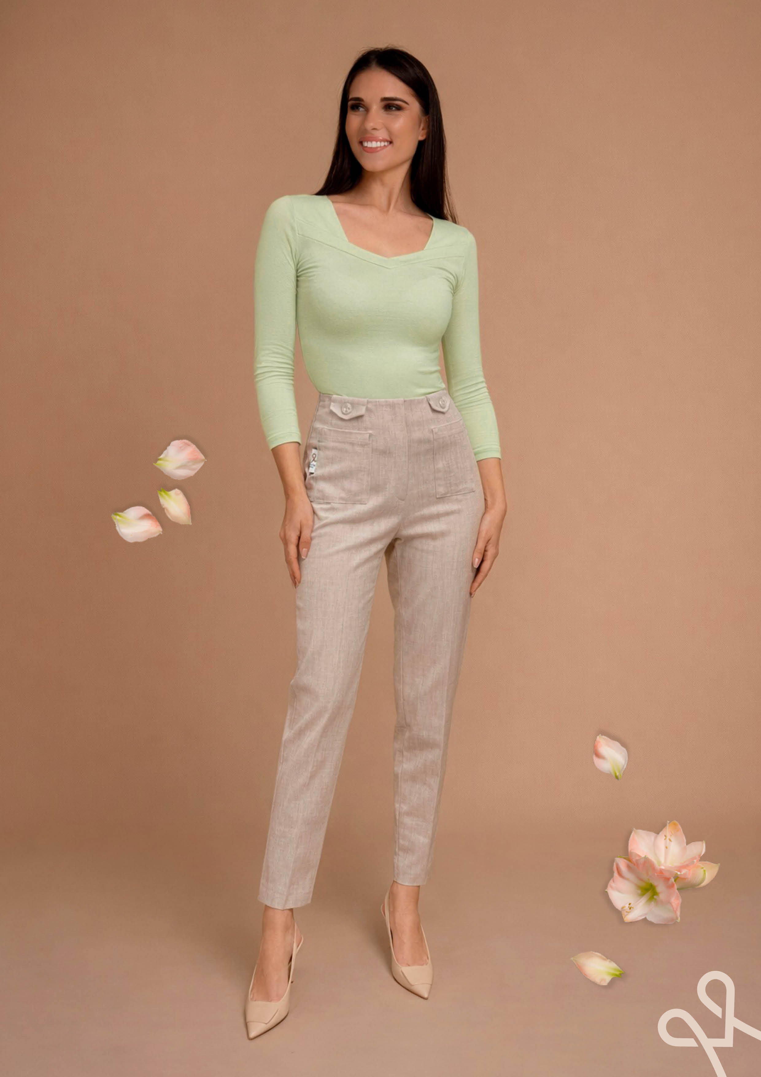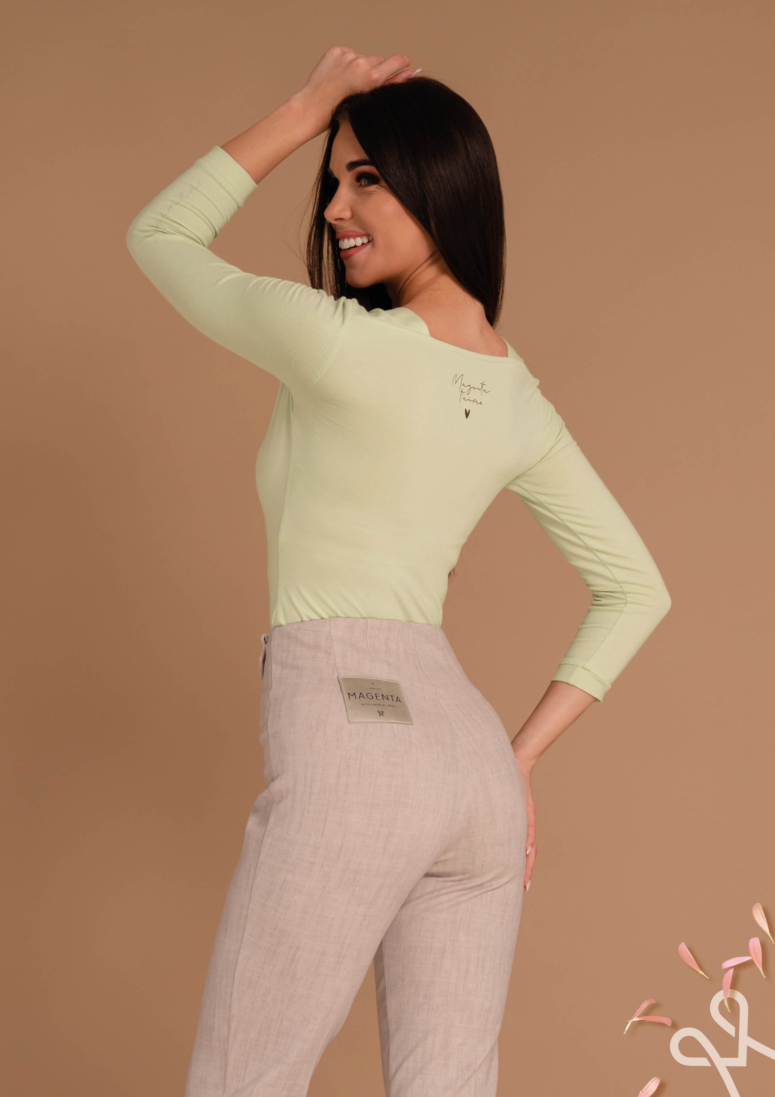 Magenta viszkóz felső, pasztell zöld színben, szűkebb fazonban, V-nyakkivágással, 3/4 ujjhosszal, hátulján filmnyomott márkajelzéssel.