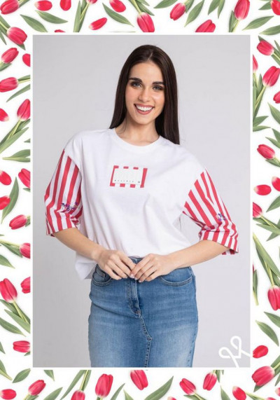 Magenta ekrü színű felső, bő fazonú, könyökig érő ujjhosszal, kerek nyakkivágással, ejtett vállrésszel. Elején rávarrt márkajelzéssel.