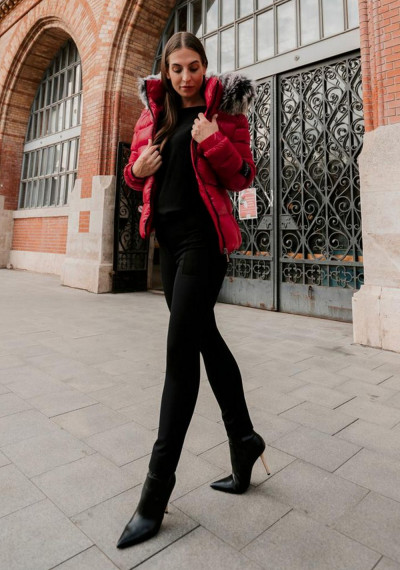 Magenta rövid állású, meleg, steppelt téli kabát, fényes piros színben. Magasított nyakrésszel, levehető prémium minőségű műszőrmés kapucnival, elején cipzáras záródással és oldalzsebekkel, ujja végén gumírozással, kezén rávarrt textil márkajelzéssel az őszi/téli Magenta kollekcióból.
