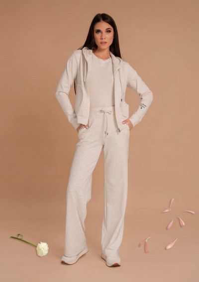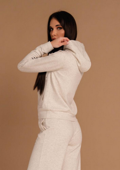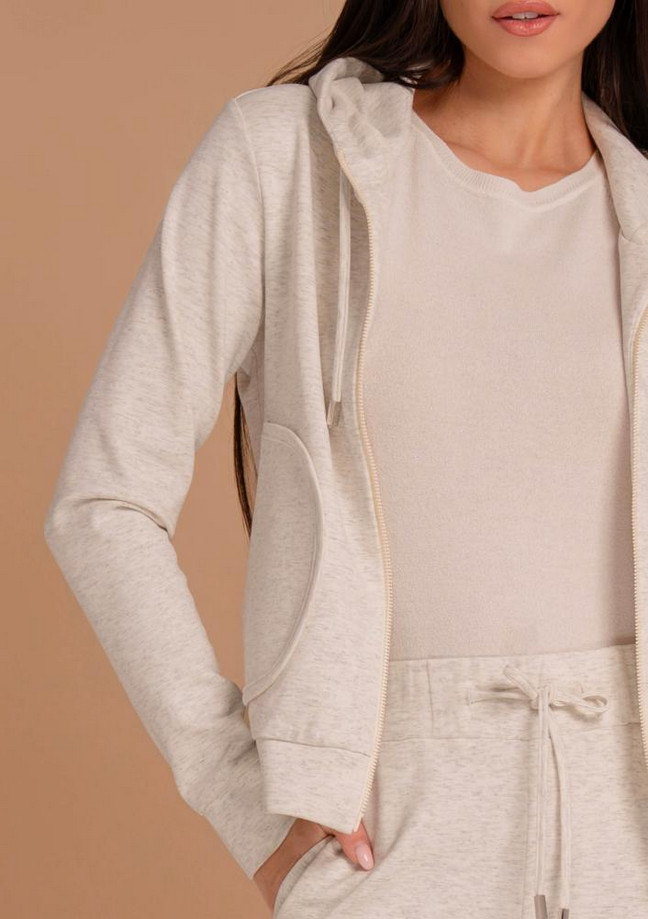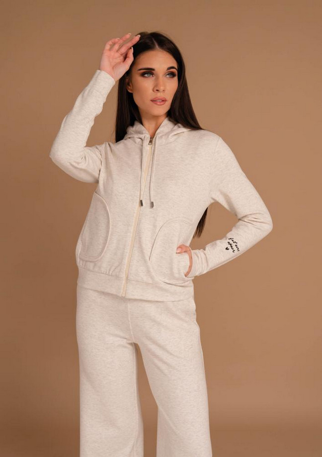 Magenta melíros bézs színű, elasztikus felső, laza fazonú, elején cipzáras záródással, zsebekkel, kapucnival. Ujján filmnyomott felirattal.