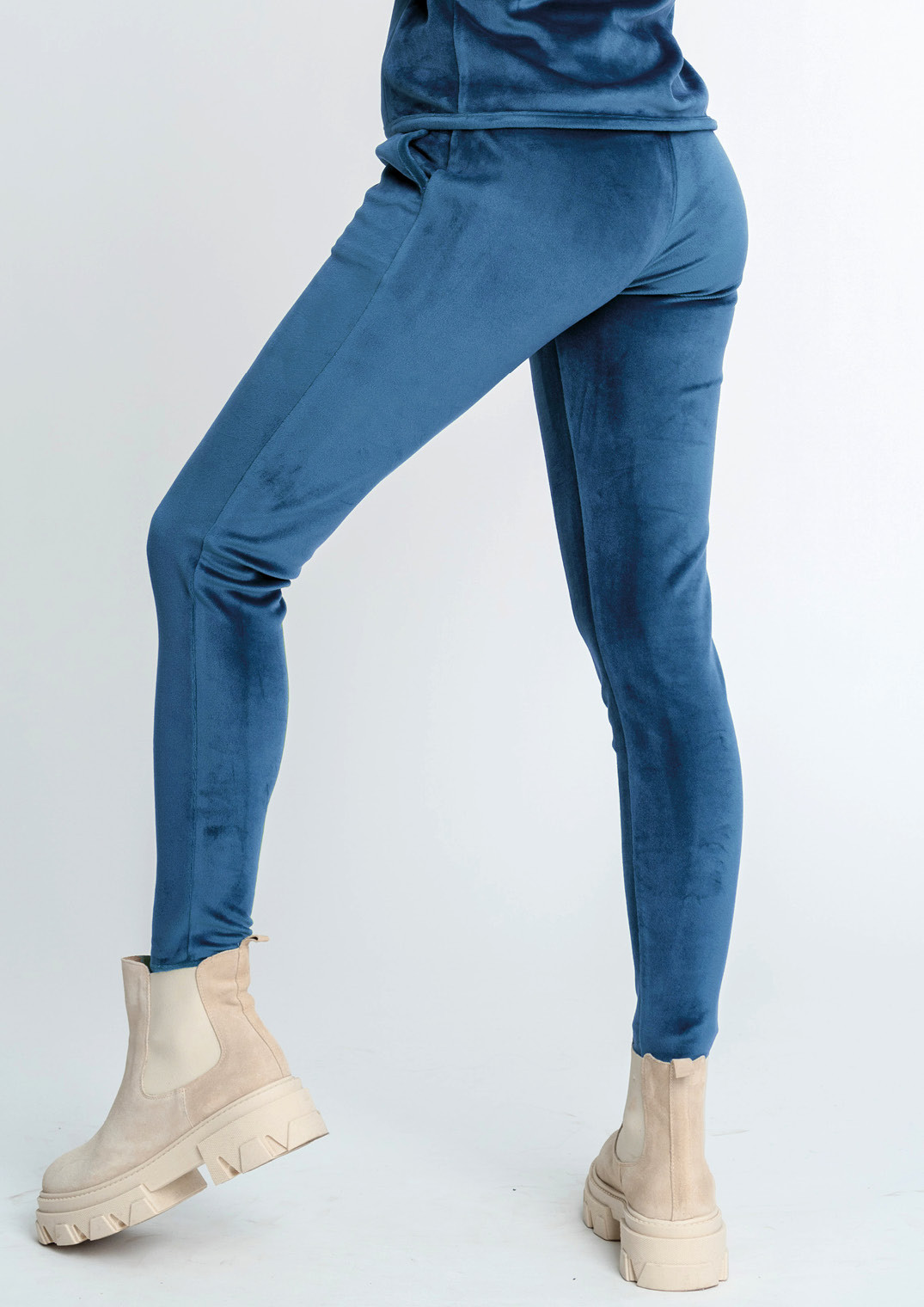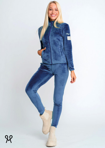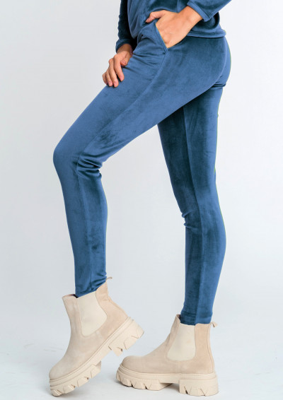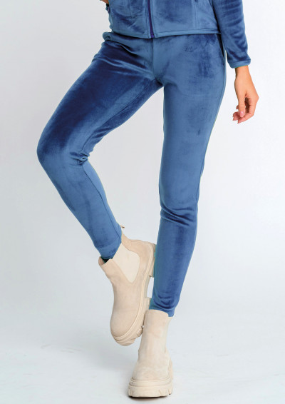 Magenta puha plüss melegítő nadrág acélkék színben, oldalzsebekkel, gumis és megkötős derékrésszel, hátán rávarrt textil márkajelzéssel a téli Magenta kollekcióból.