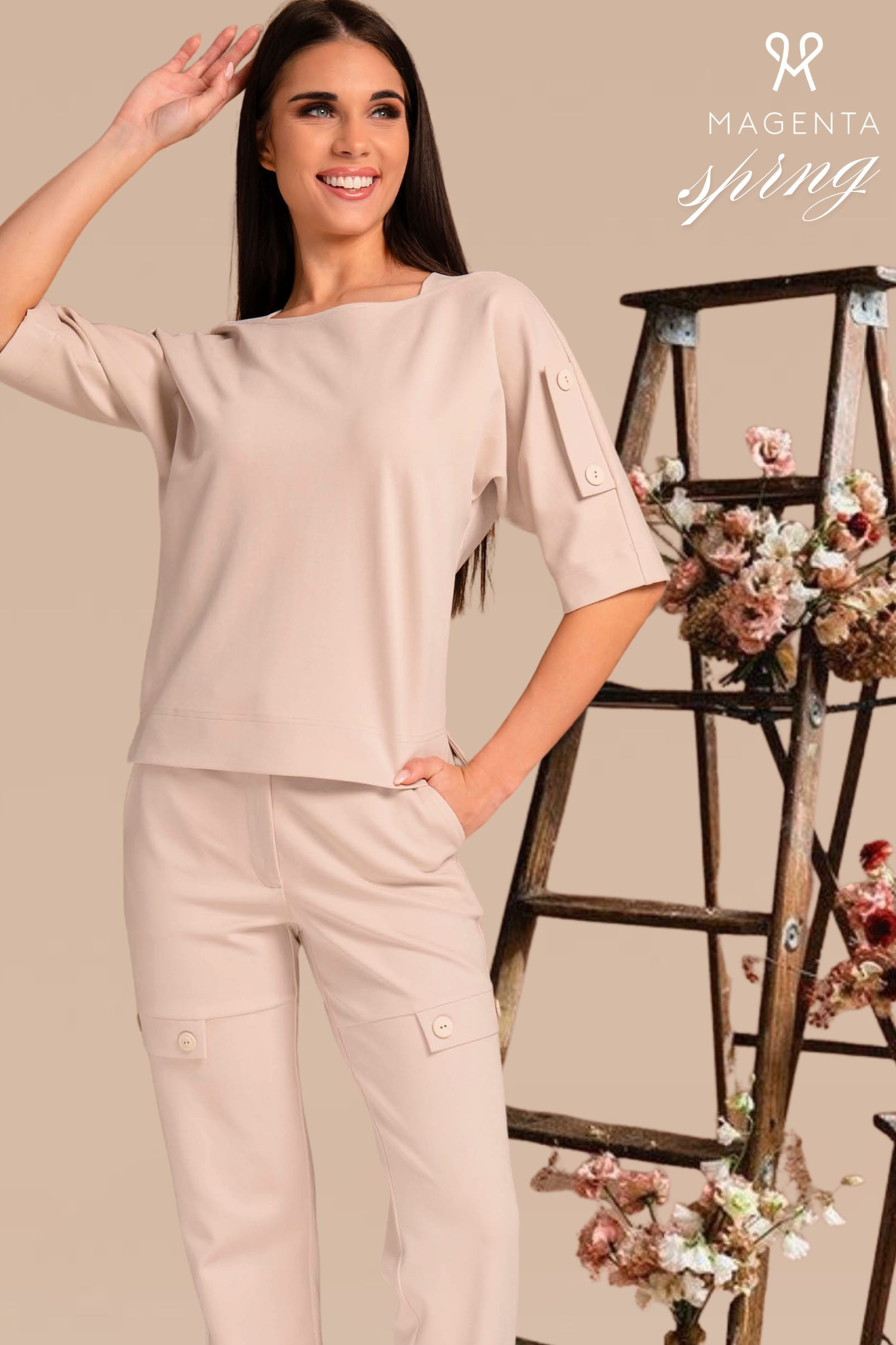 Magenta szűkebb szárú bézs színű nadrág, oldalán zsebfedős részletekkel, oldal- és farzsebes fazonban, elején gombos és zippzáras záródással, övbújtatós derékrésszel. Hátul filmnyomott Magenta márkajelzés.