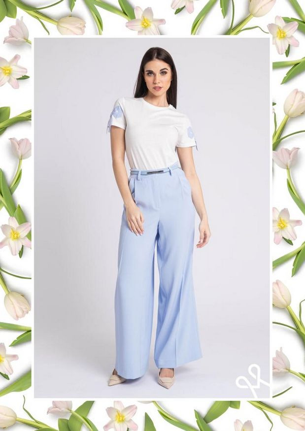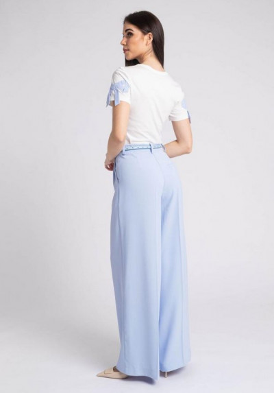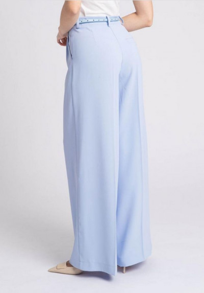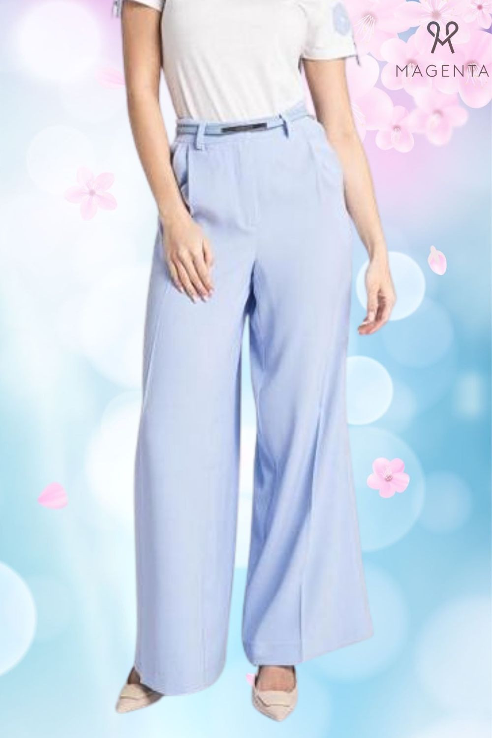 Magenta kevert szálas nadrág, világoskék színben, bővebb szárú, elején hajtásokkal, elején kapcsos és gombos záródással, övbújtatós derékrésszel, zsebekkel. Hátul rávarrt fém márkajelzéssel.