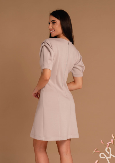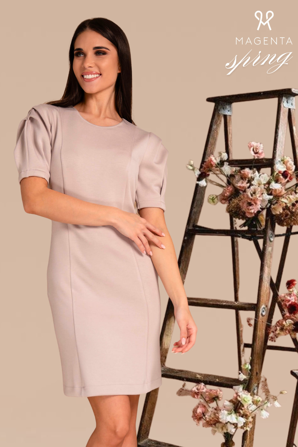 Magenta ruha, natúrbézs színben, kevert szálas elasztikus, kerek nyakkivágással, ujján rakott megoldással, ujján rávarrt fém márkajelzéssel.