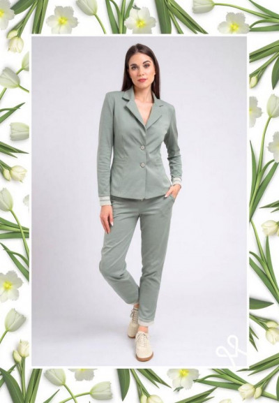 Magenta sportos, elasztikus zakó, pasztell kheki színben, válltöméssel, alakot követő fazonnal, zsebekkel, elején gombos záródással, ujja alján merev passzéval. Hátul rávarrt márkajelzéssel.