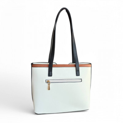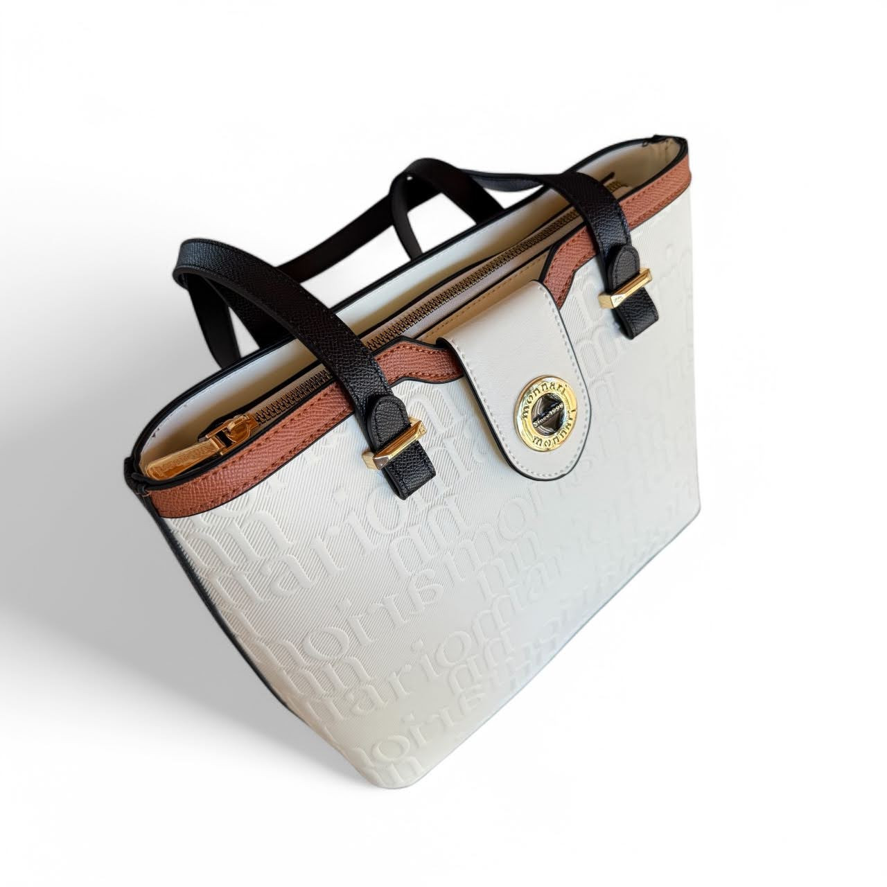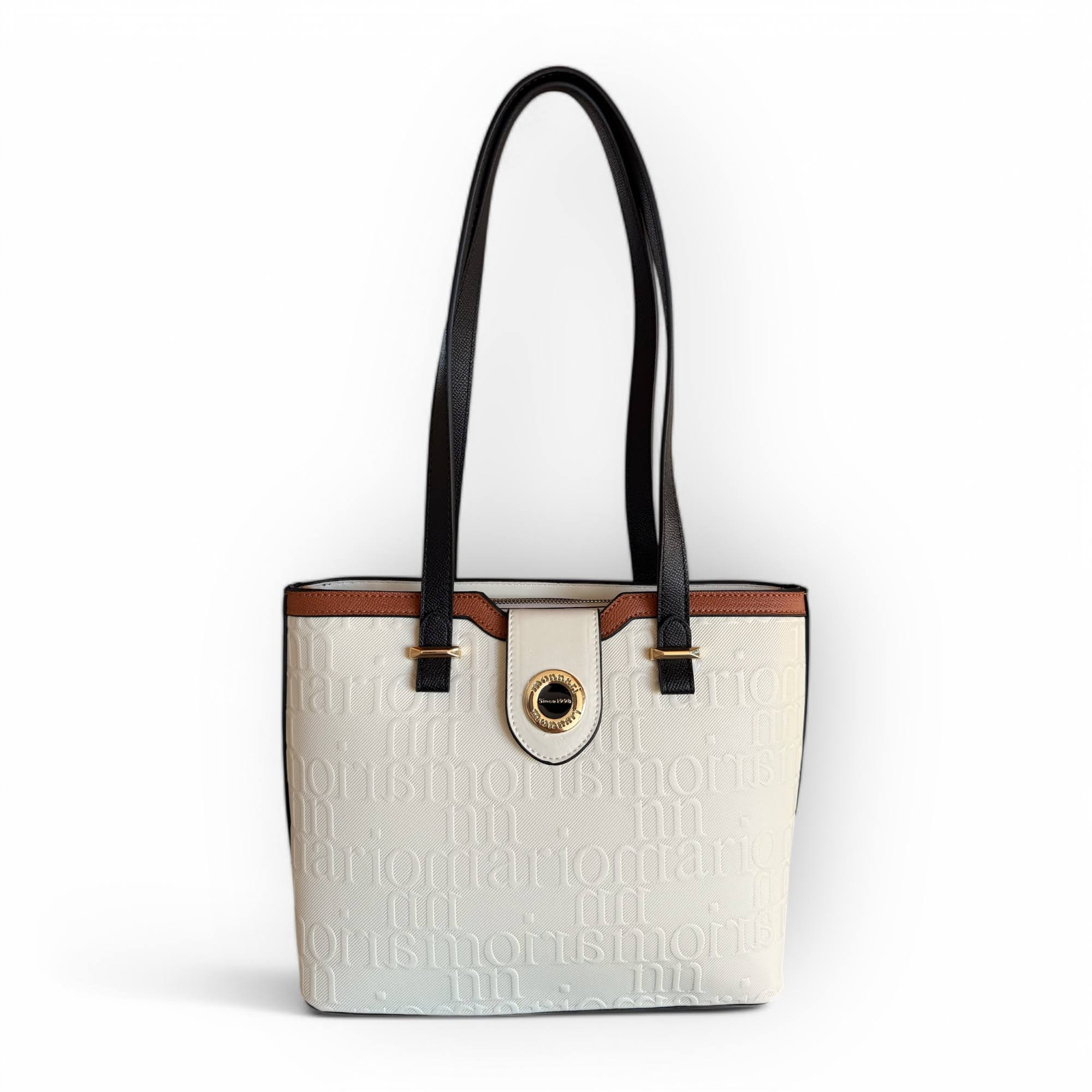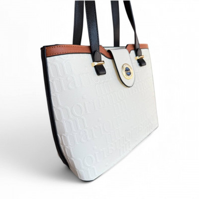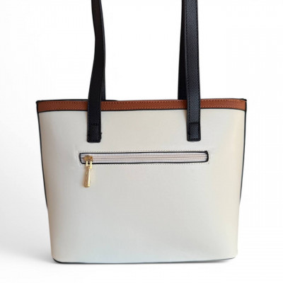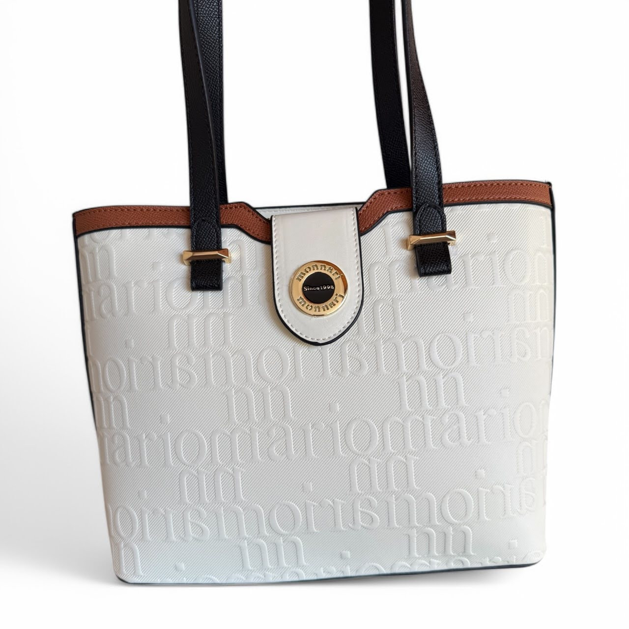 Monnari női táska, krém színben, mintás bőr hatású anyagból, fix vállpánttal, cipzáros záródással. Egyterű márkajlezett textillel bélelt belsőrészében egy cipzáros és két nyitott, hátulján egy cipzáras zsebbel. Márkajelzett fém kellékekkel, elején nyomott márkajelzéssel.