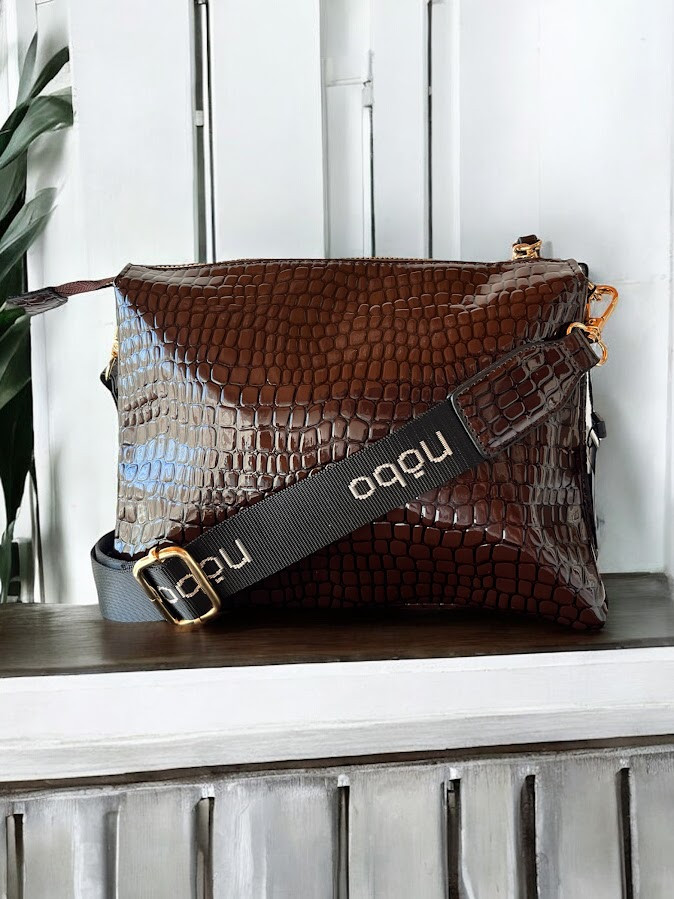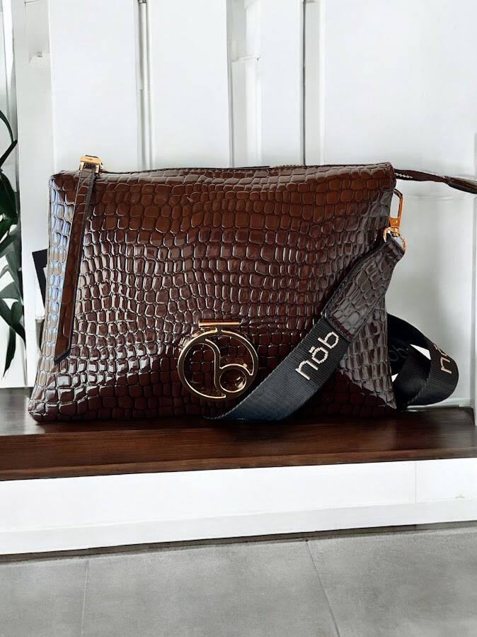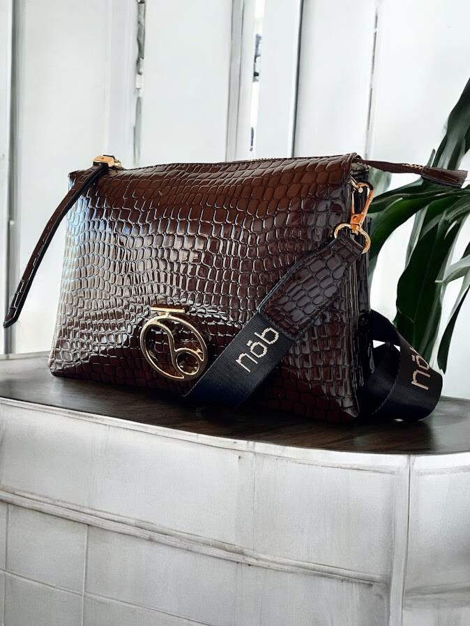 Nobo női váll- és oldaltáska, fényes, bőrhatású anyagból, étcsokoládébarna színben, lecsatolható és állítható vállpánttal, cipzáras záródással, belsejében három rekesszel, két kisebb és egy nagy cipzáras zsebbel, elején fém márkajelzéssel.