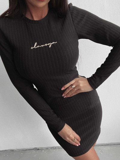 O La Voga szűk fazonú női ruha fekete színben, anyagában bordázott, elején hímzett márkajelzéssel.