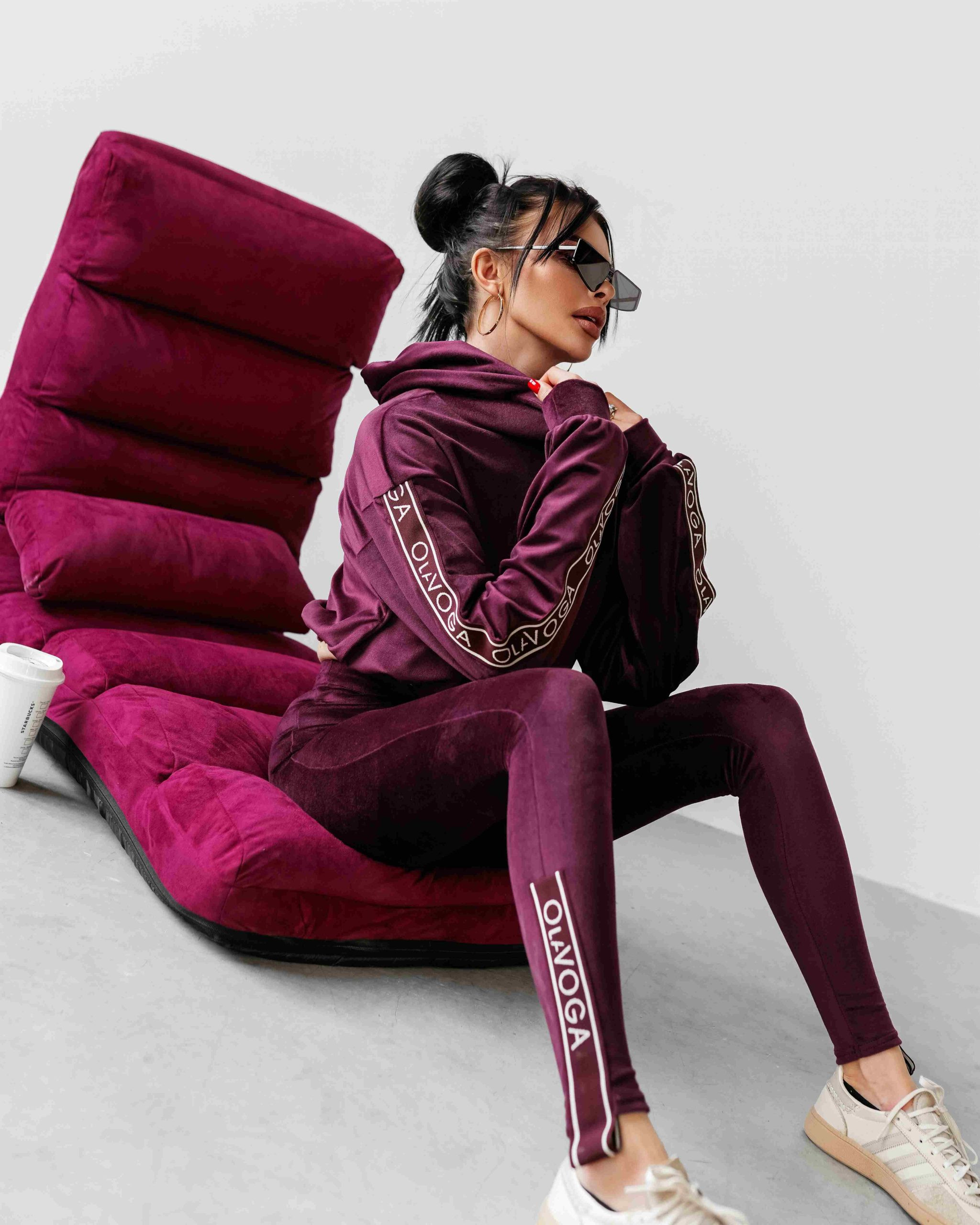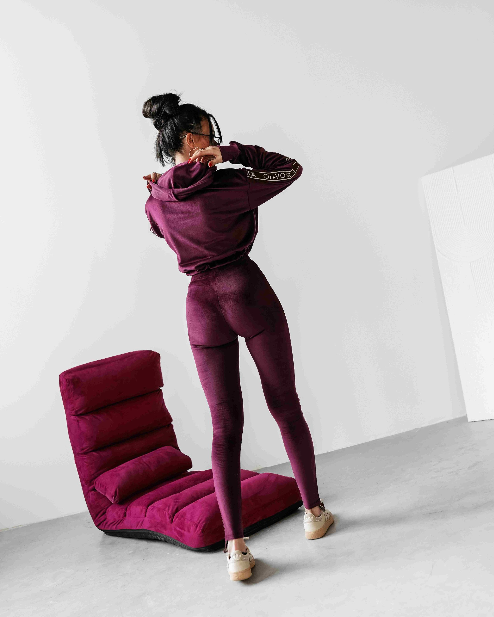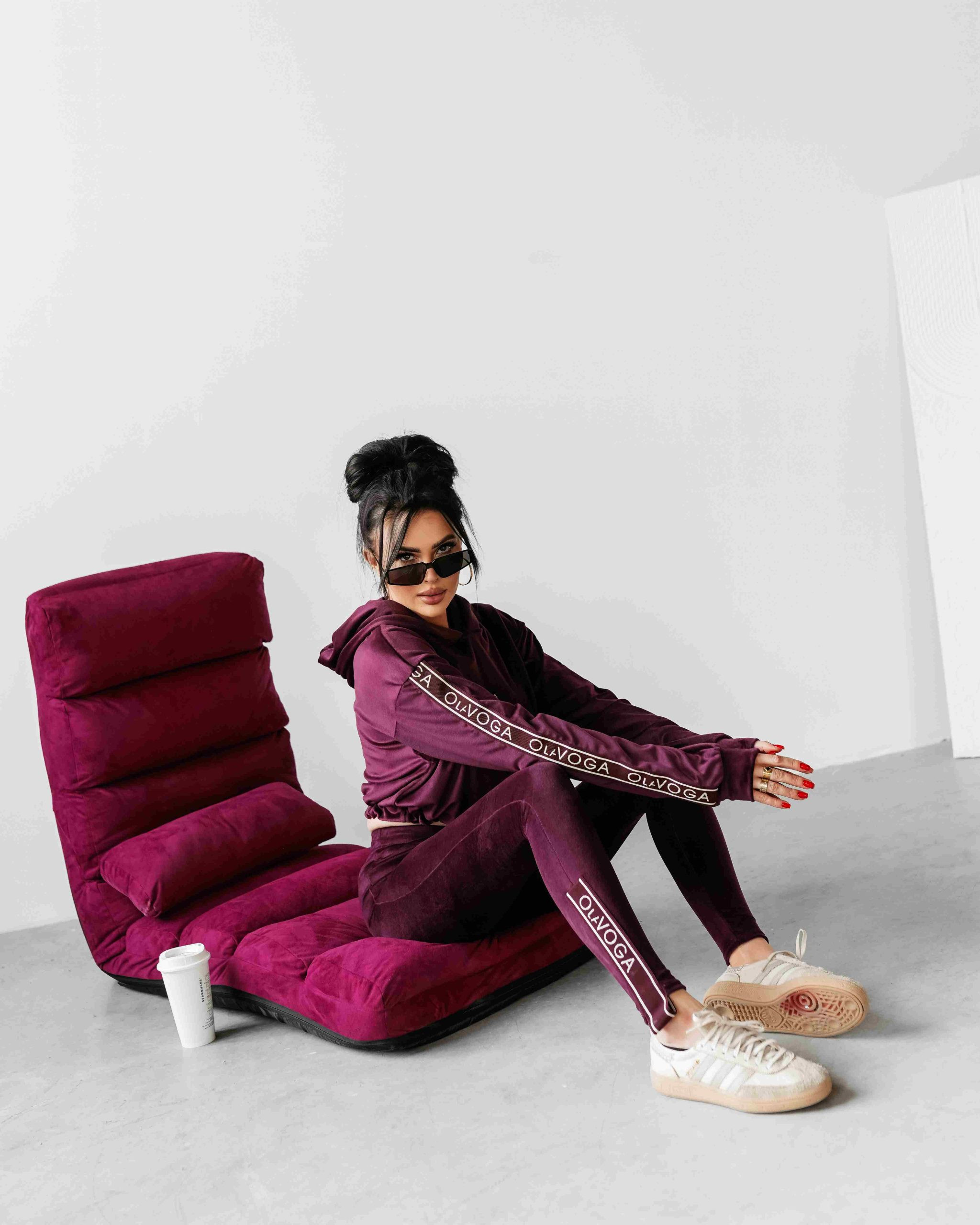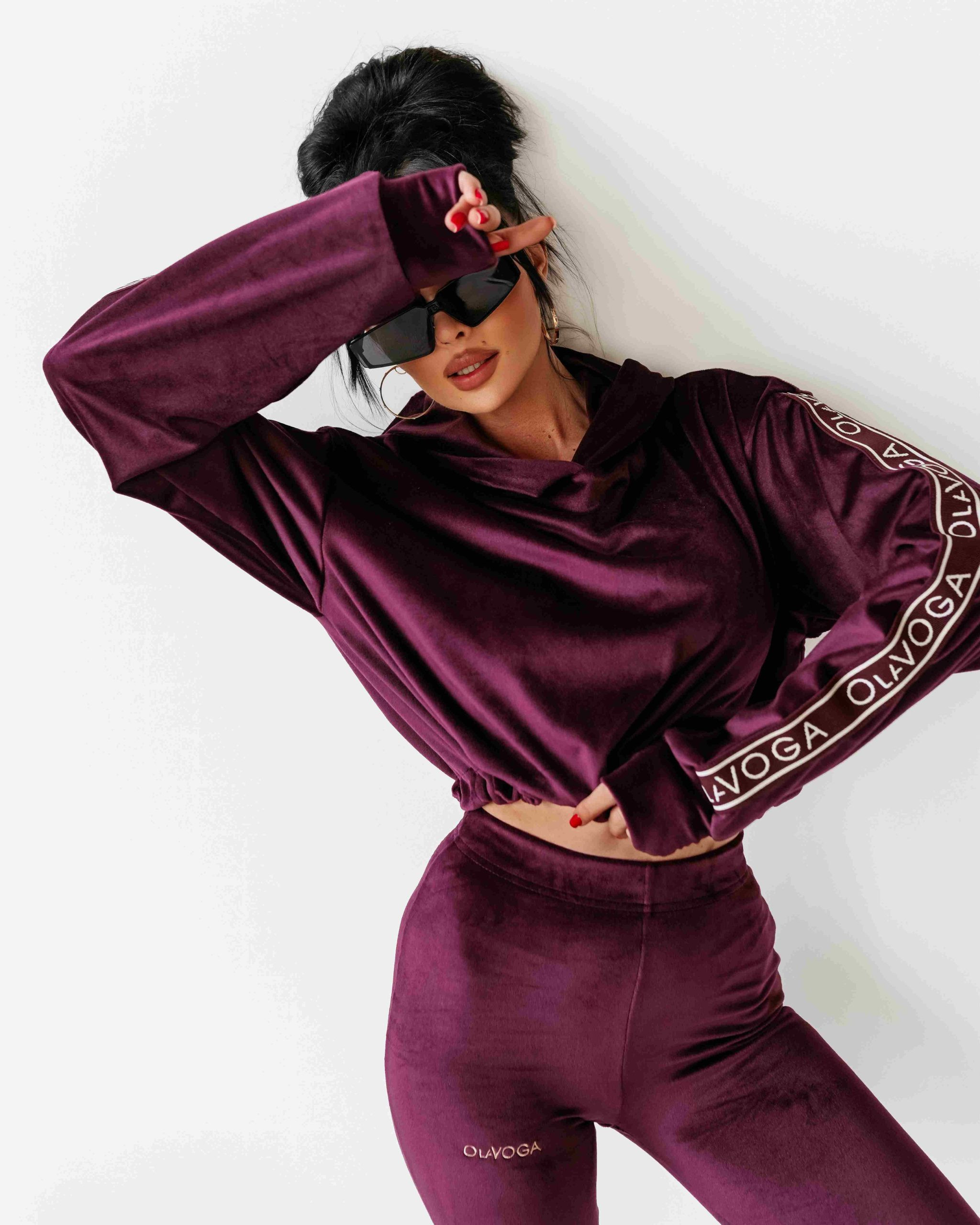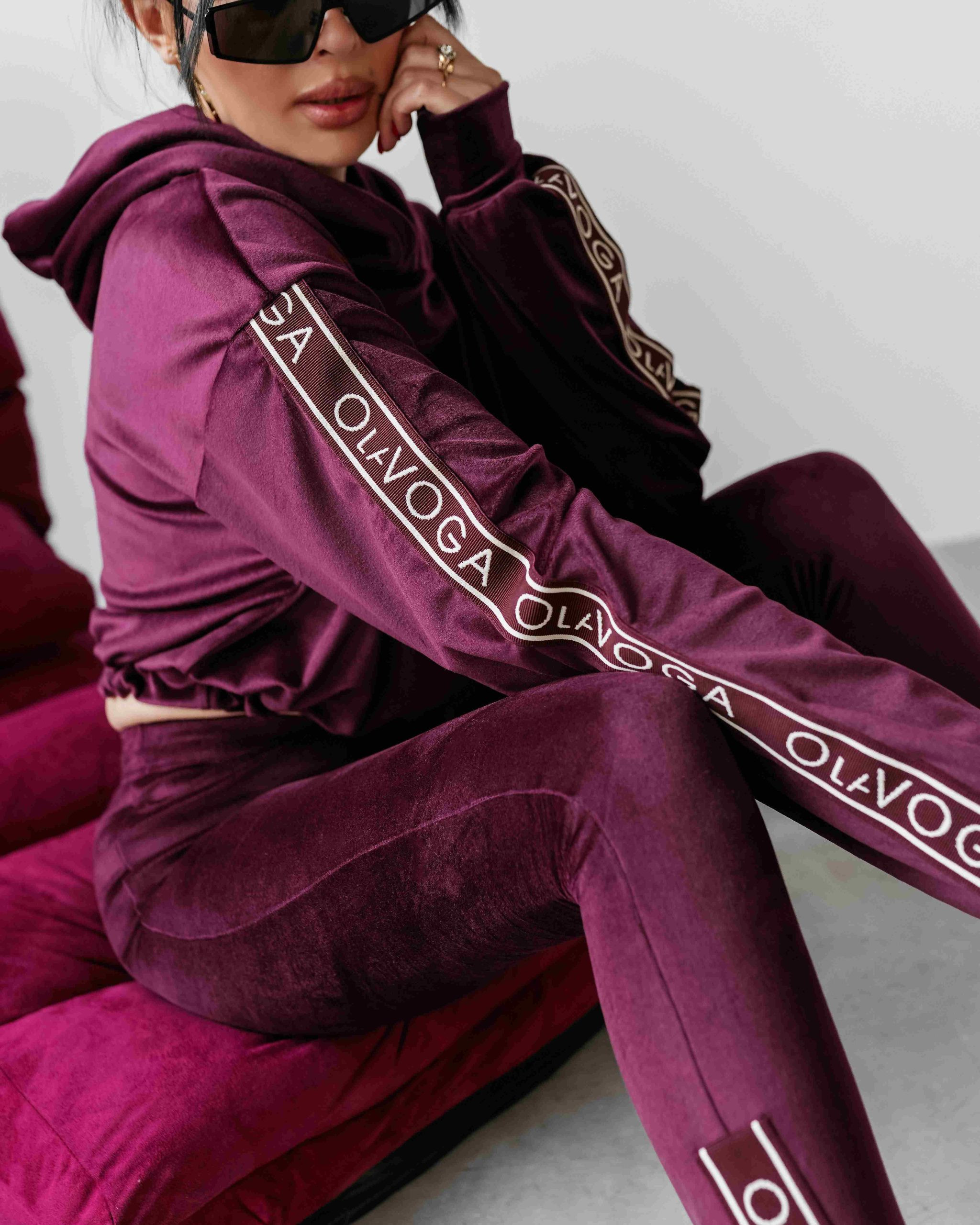 O La Voga női plüss melegítő szett, szilva lila színben, a kapucnis felső bő fazonban,ujján passzéval készült, alja húzózsinórral szűkíthető, elején hímzett márkajelzéssel, ujján márkajelzett gumírozással, alsórésze egy gumírozott derekú leggingsből áll, combján hímzett márkajelzés található, szárvégén márkajelzett gumírozással.