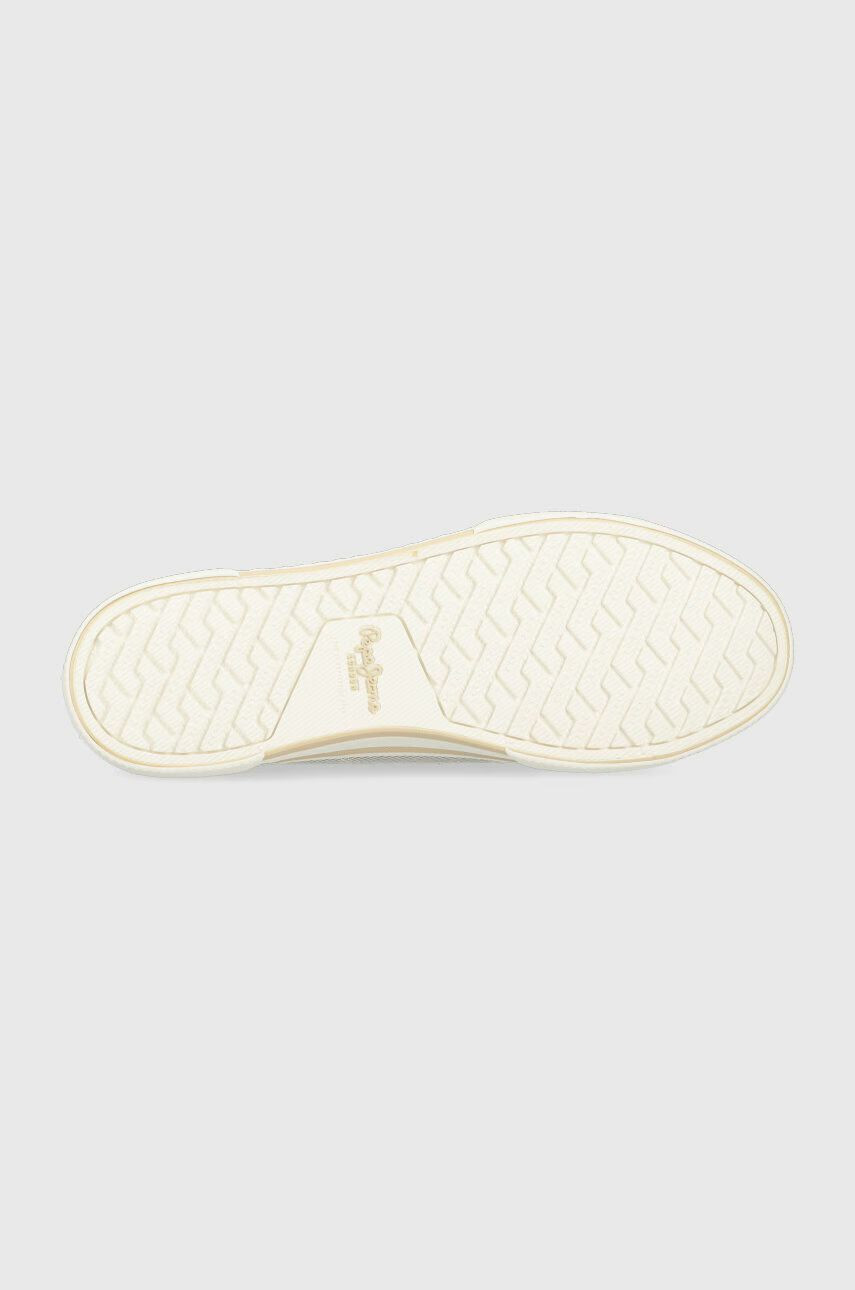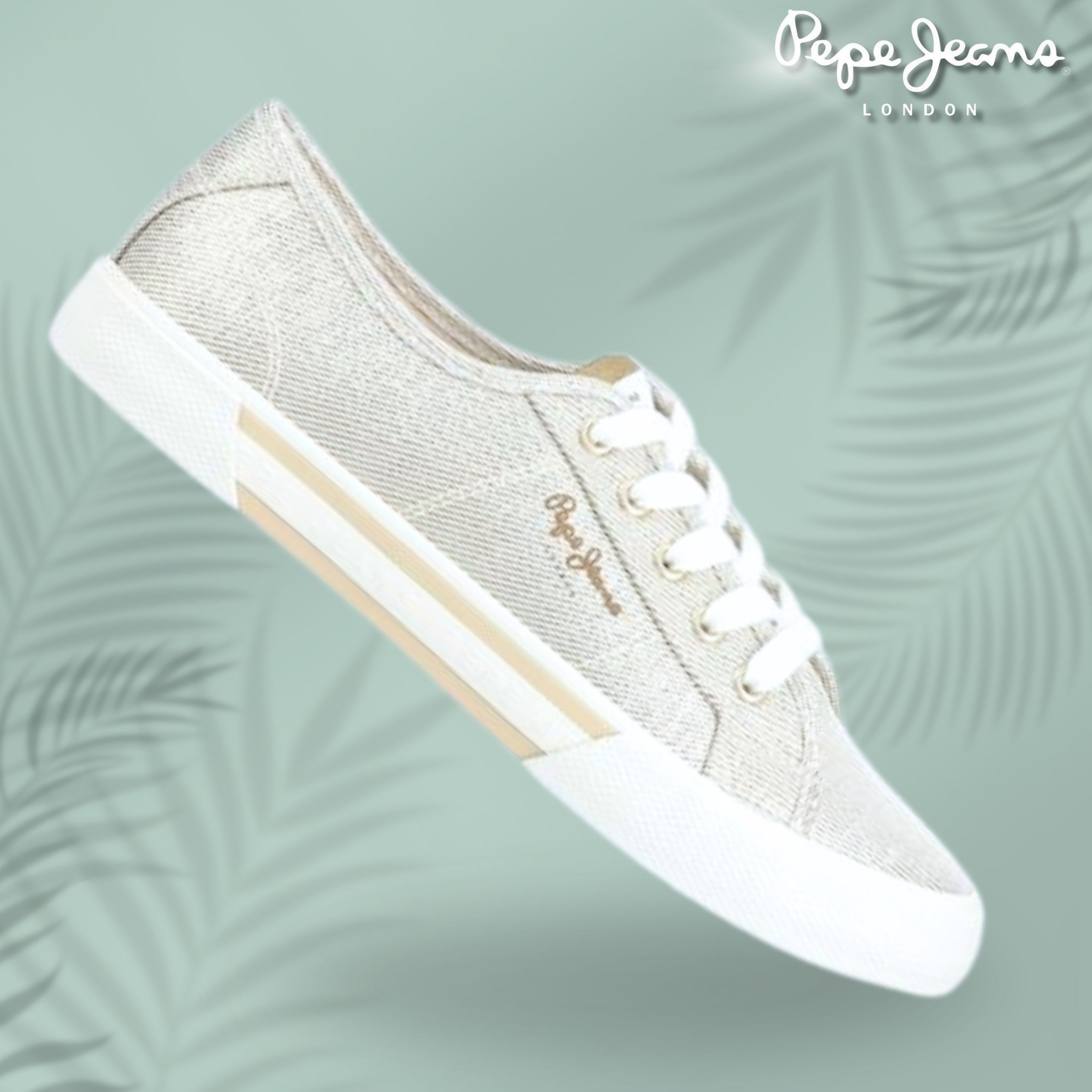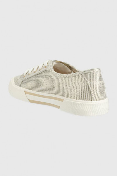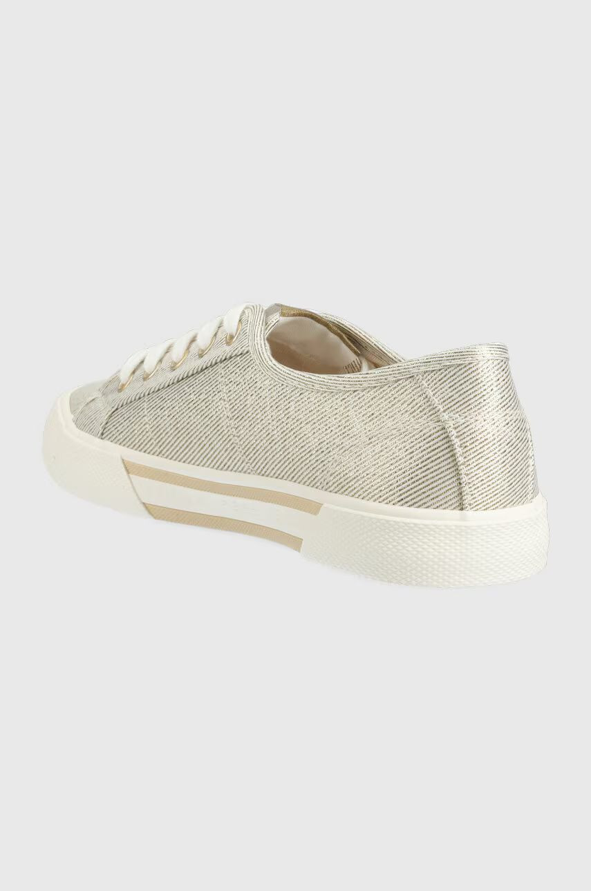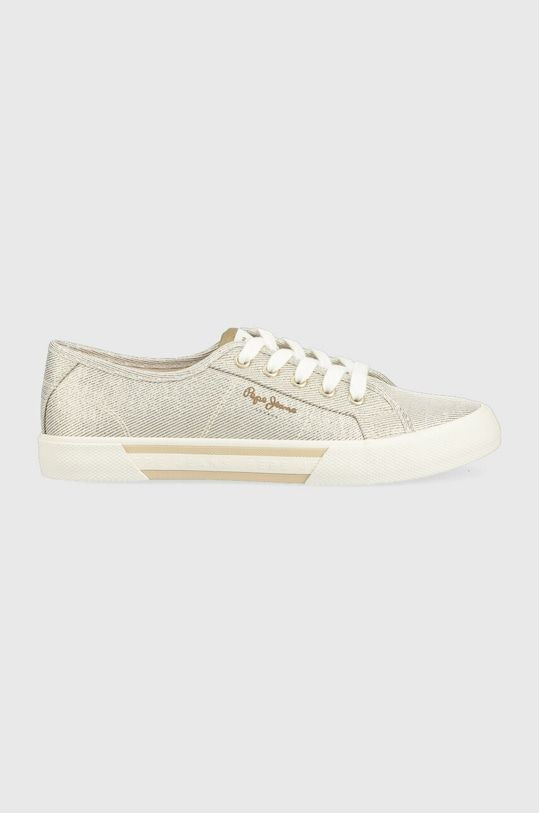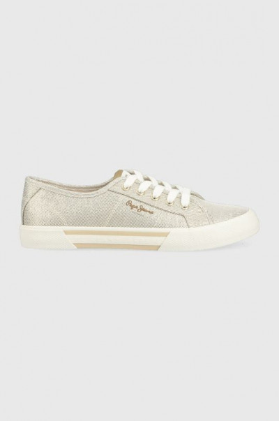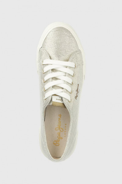 Pepe Jeans női vászon cipő, lurex szálakkal, fűzős kialakítású felsőrésszel, fehér színű gumitalppal, nyelvén- sarkánál és külső oldalán márkajelzésekkel.