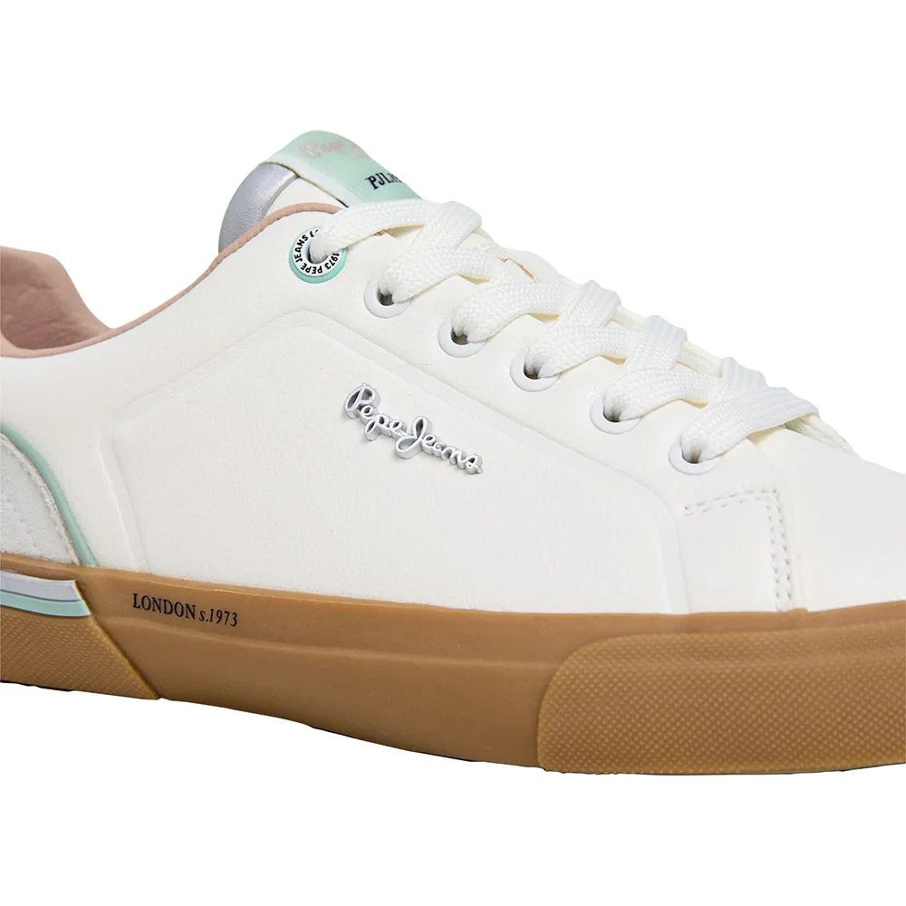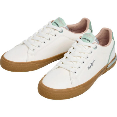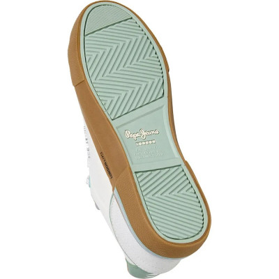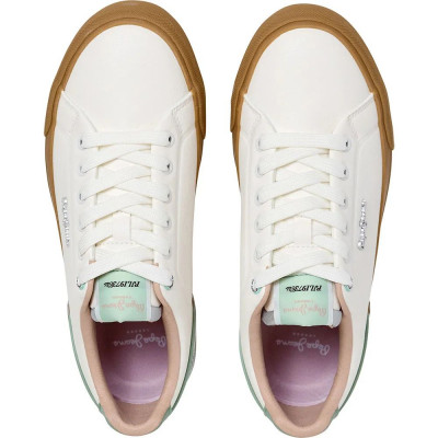 Pepe Jeans női bőr cipő, fehér és-pisztácia színben, fűzős kialakítású felsőrésszel, barna színű gumitalppal, nyelvén- és külső oldalán márkajelzésekkel.