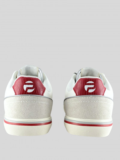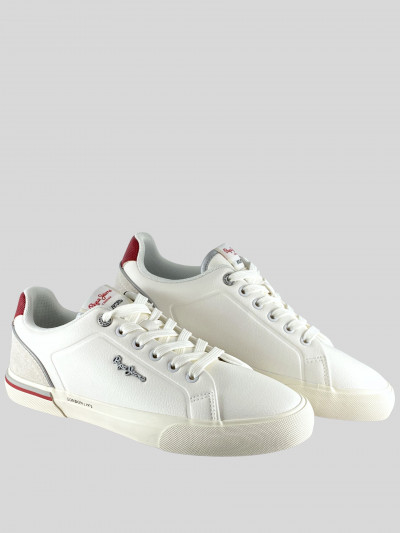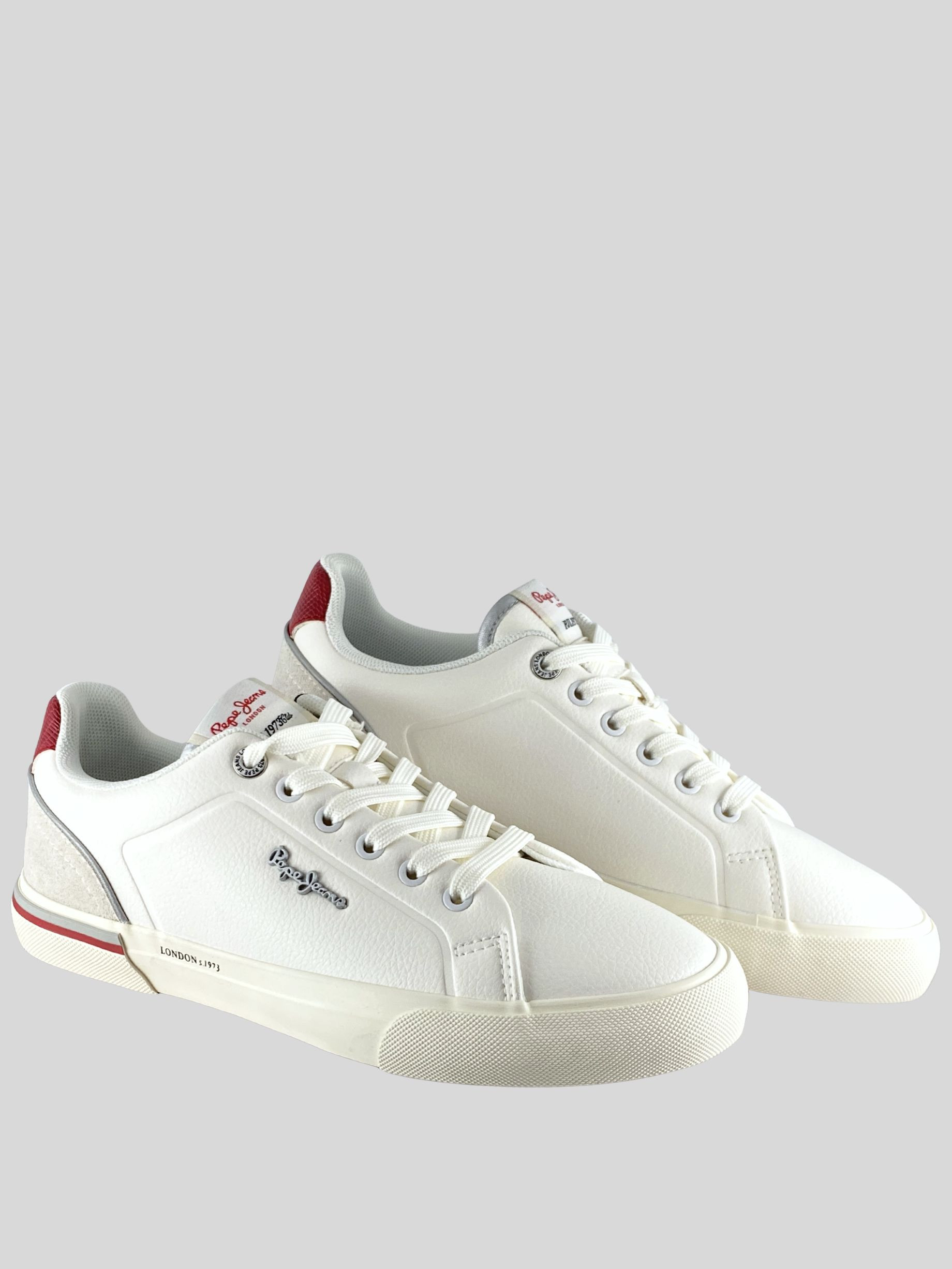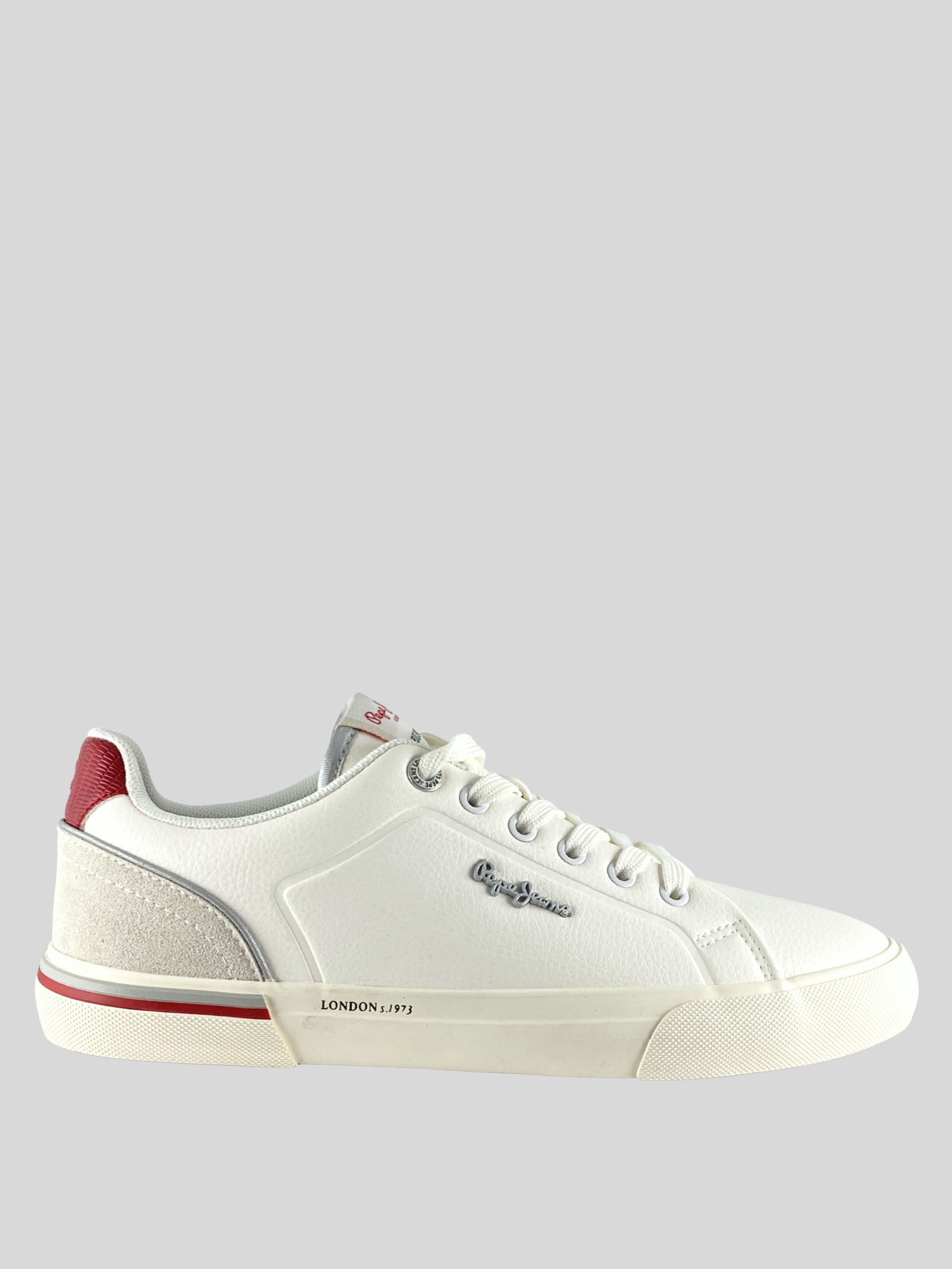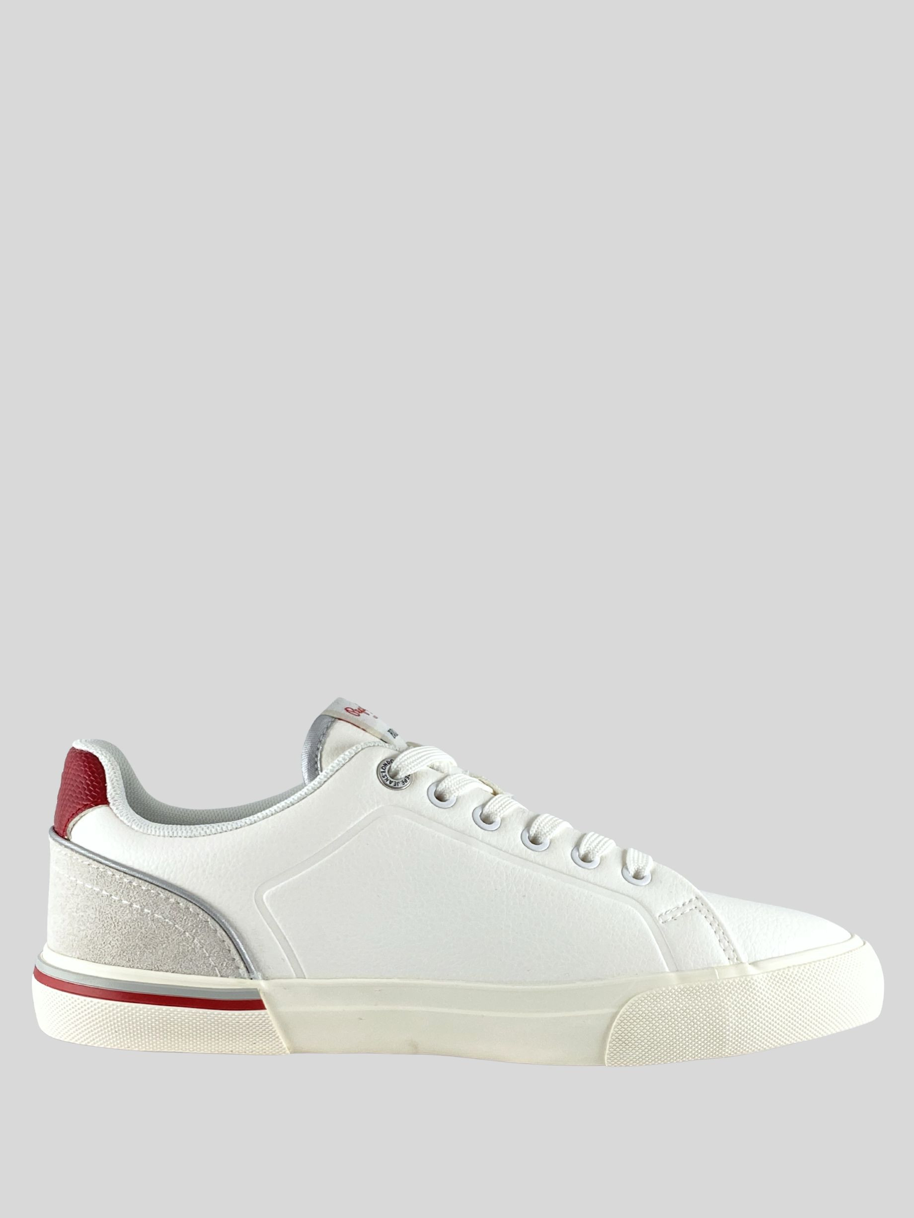Pepe Jeans női bőr cipő, fehér és-piros színben, fűzős kialakítású felsőrésszel, barna színű gumitalppal, nyelvén- és külső oldalán márkajelzésekkel.
