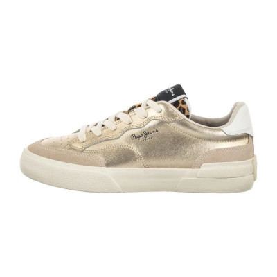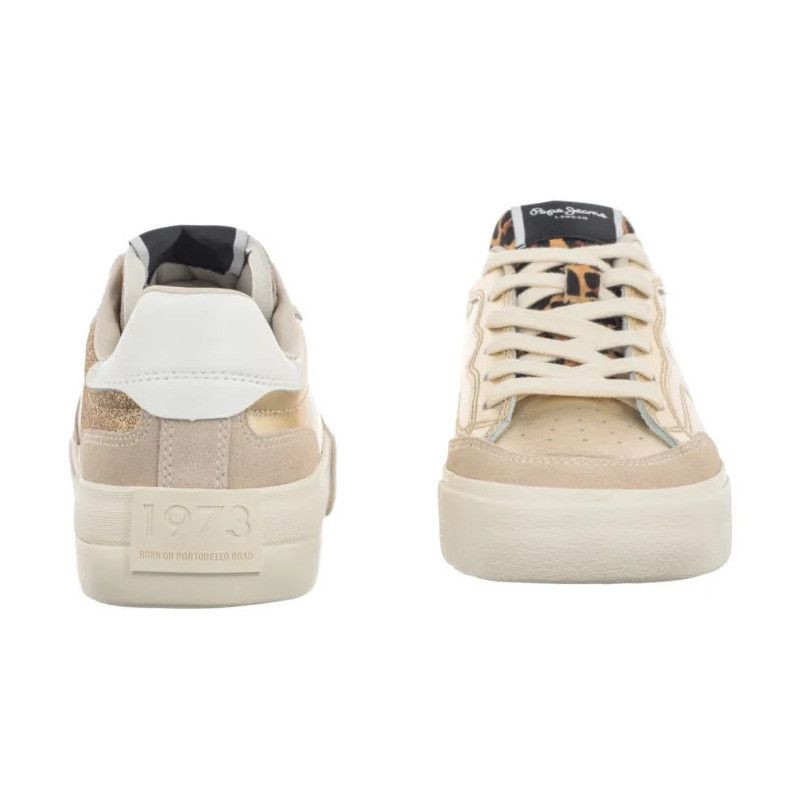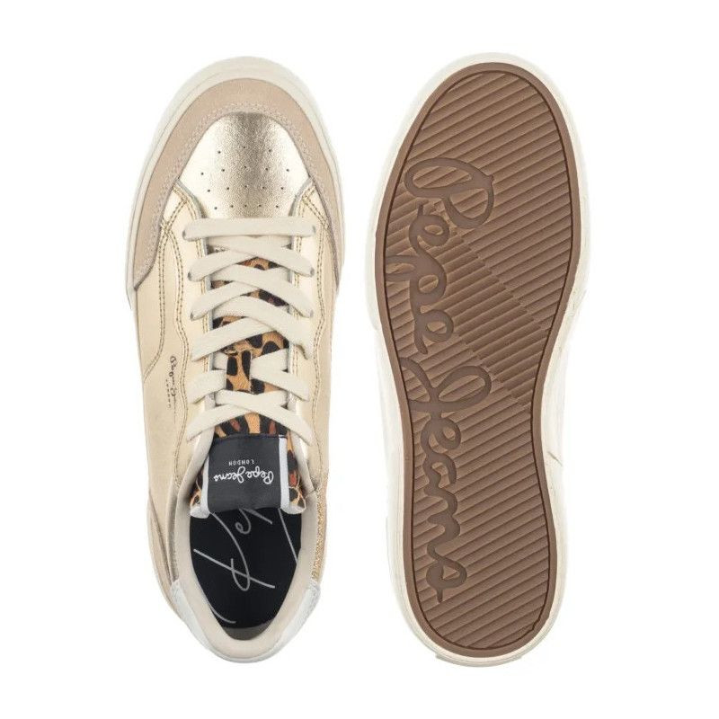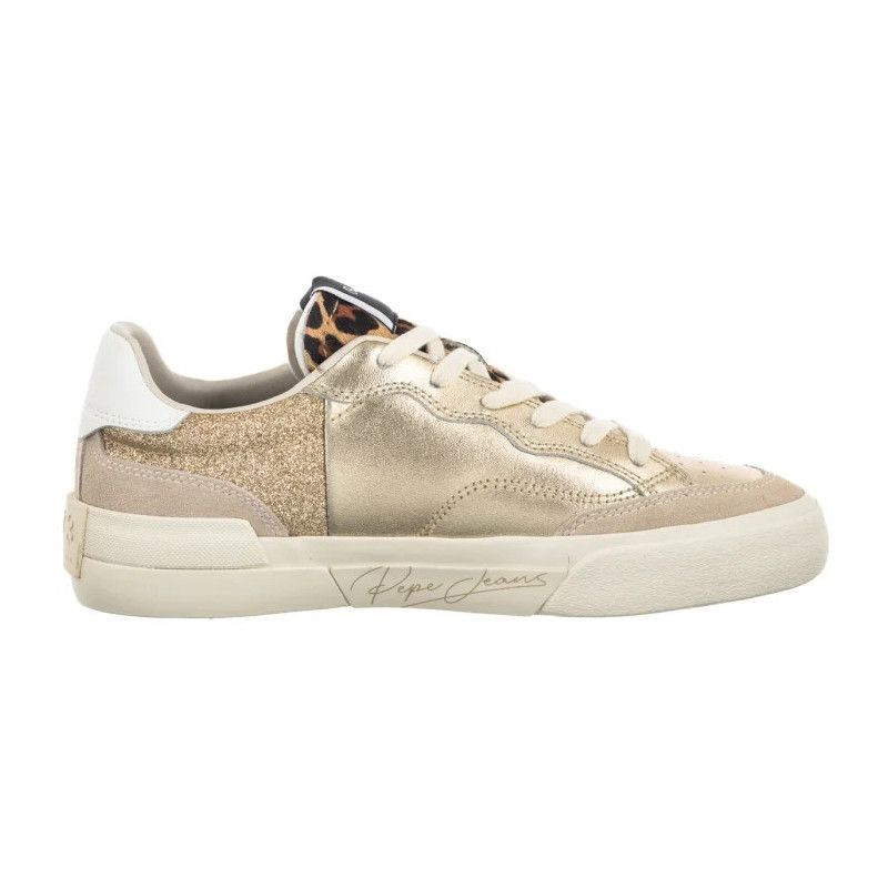 Pepe Jeans női bőr cipő, fehér és arany színben ocelot mintával, fűzős kialakítású felsőrésszel, fehér színű gumitalppal, nyelvén- sarkánál és külső oldalán márkajelzésekkel.