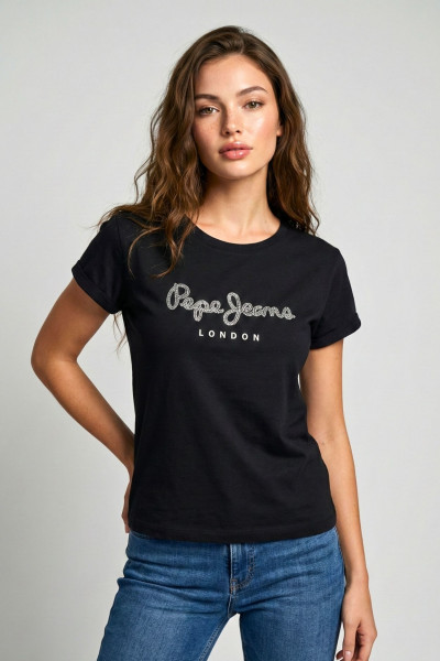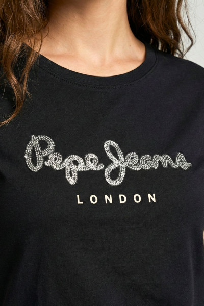 Pepe Jeans női póló, fekete színben, egyhén bő fazonban, kerek nyakkivágással, elején flitteres márkajelzéssel.