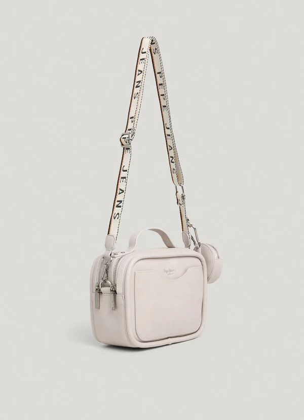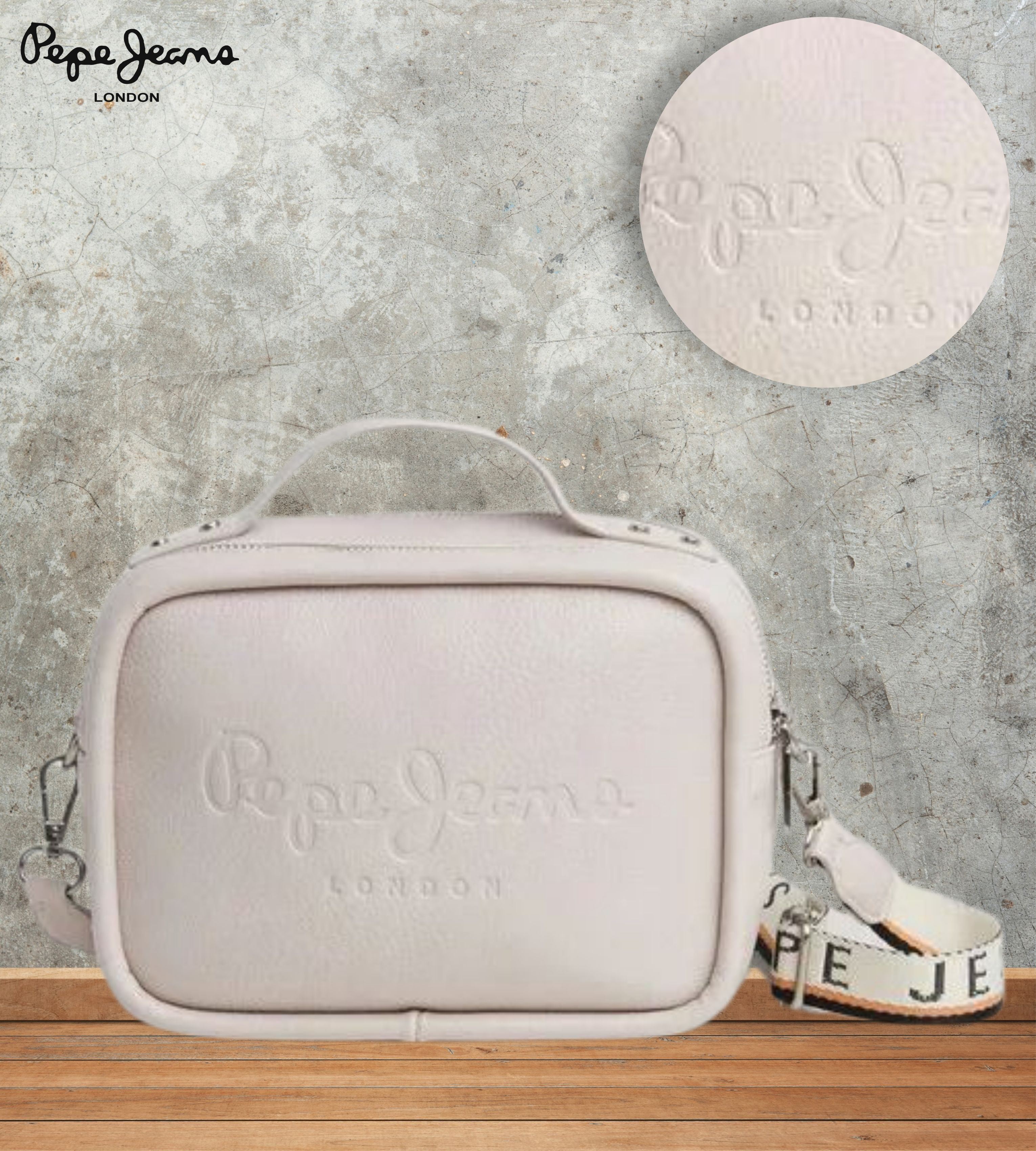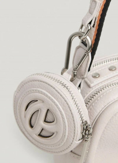 Pepe Jeans női műbőr táska, halvány pasztell púder színben. Két terű belseje cipzáras záródású, egy cipzáras zsebbel, hátulján egy nyitott zsebbel. Márkajelzett vászon pánttal, és egy lecsatolható logózott mini táskával, elején nyomott hátulján filmnyomott márkajelzéssel.