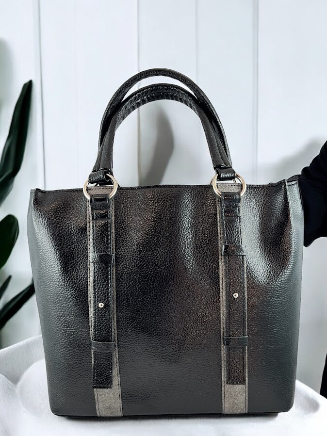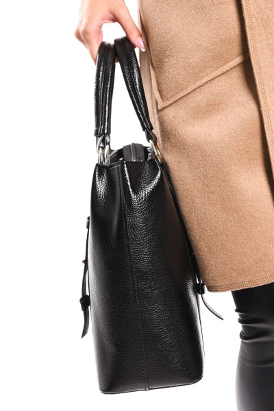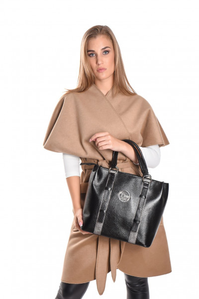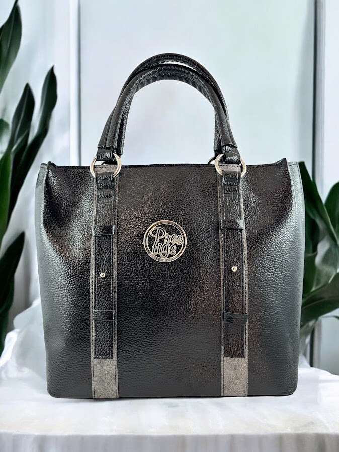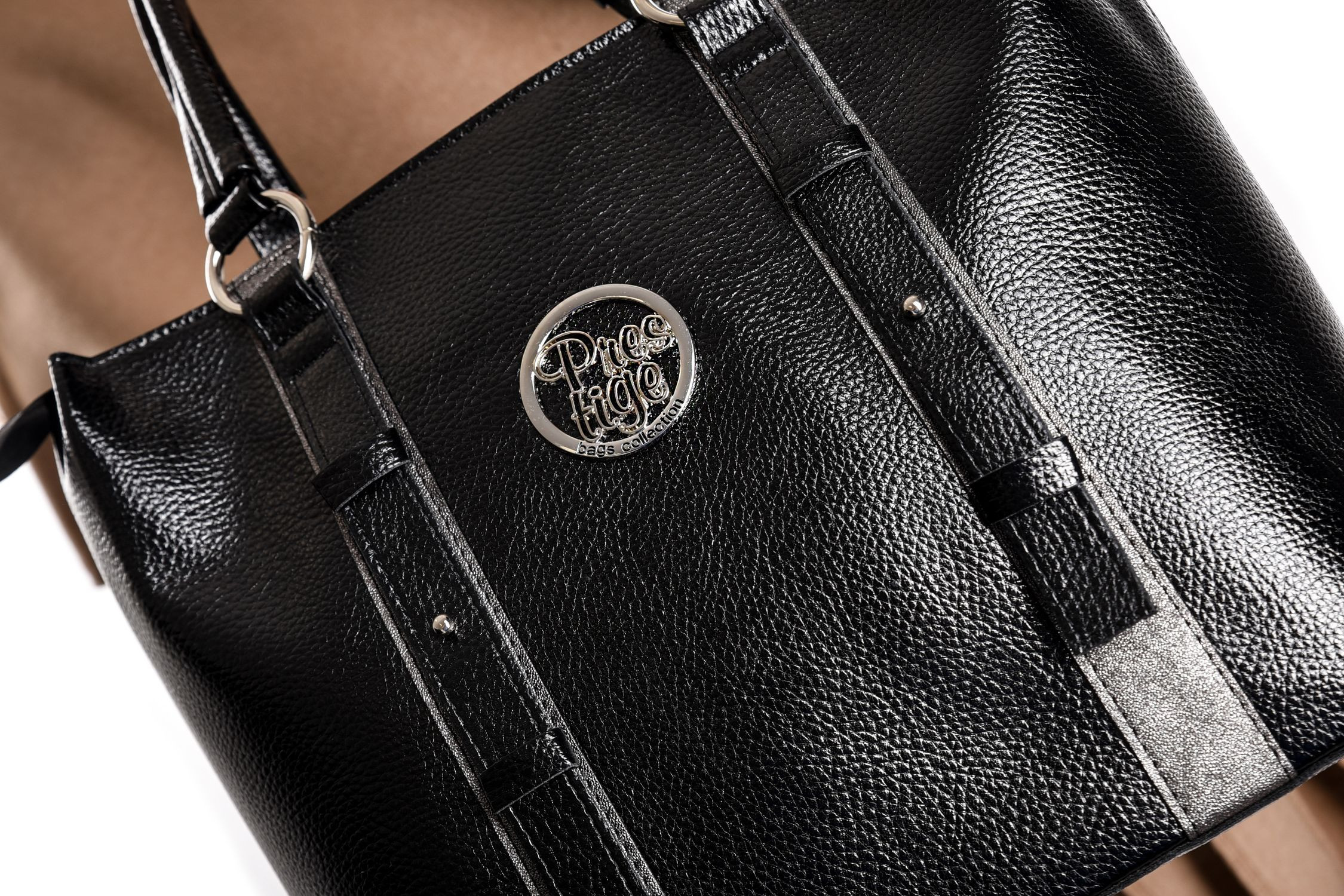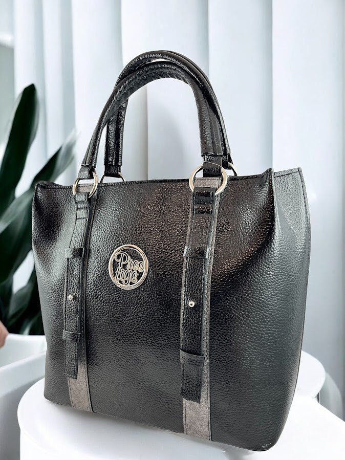 Prestige női válltáska, fekete színű mintás bőrhatás anyagból, állítható és levehető pánttal, cipzáras záródással, belseje egyterű, benne egy cipzáras zsebbel és egy rekesszel, pántos díszítéssel, elején fém márkajelzéssel.