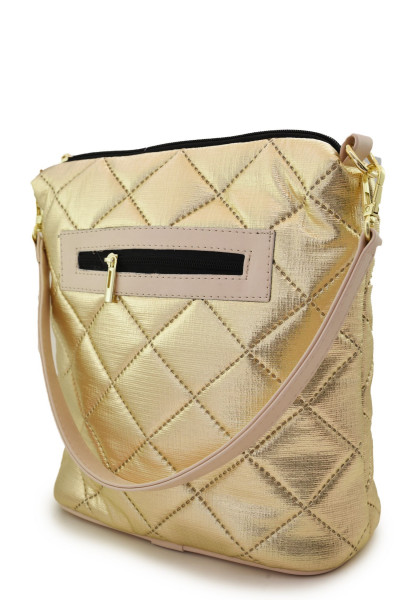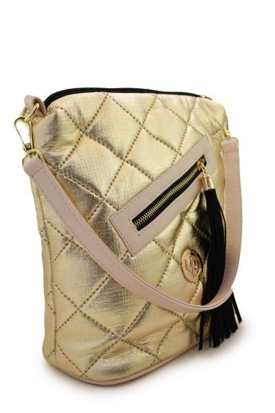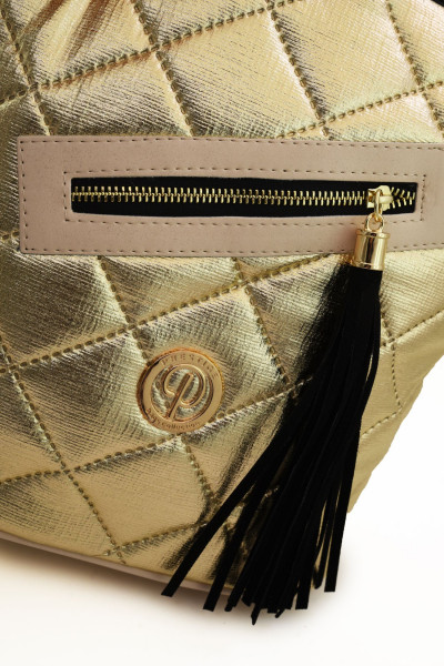 Prestige váll és oldaltáska arany színű orkán anyagú steppelt mintás- és bézs színű műbőr anyagból; cipzáras záródással; lecsatolható állítható pánttal, mellyel oldaltáskává alakítható; egyterű belsőrésszel; belsejében egy rekesszel és egy cipzáros zsebbel; elején és hátulján cipzáras zsebbel; rojtos díszítéssel és fém márkajelzéssel a Prestige kollekcióból.